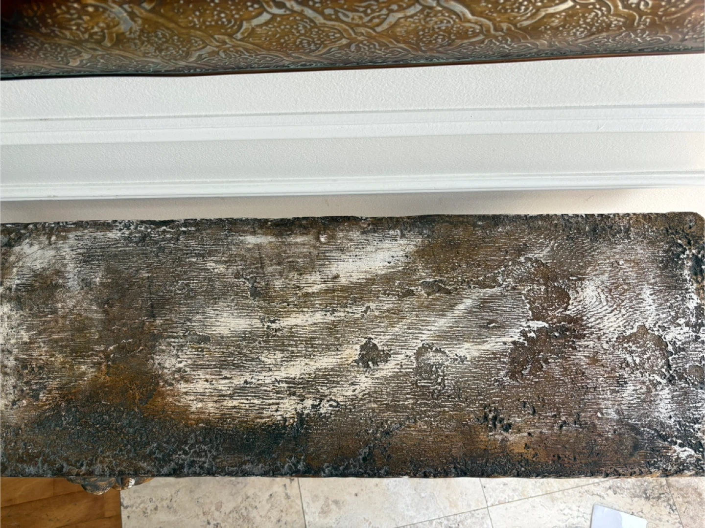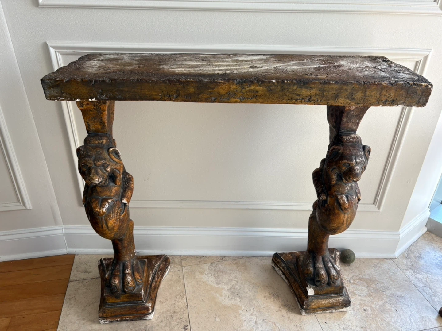 Beautiful and unique console table featuring a solid granite top and stone base with lion details. This piece has an old world, rustic charm that makes a statement for an entryway, hallway, or living room. Heavy and sturdy construction granite top with natural Pantina.