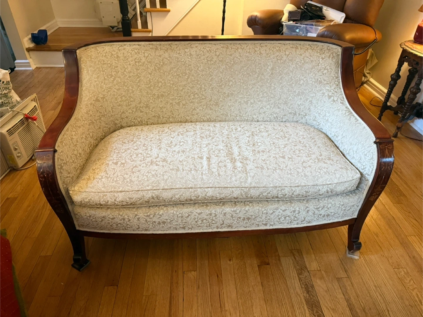 73Selling an antique-style loveseat and armchair set. They feature a cream-colored patterned fabric and dark wood trim. These pieces would add a touch of vintage charm to any room Sold as in GREAT/ EXCELLENT condition