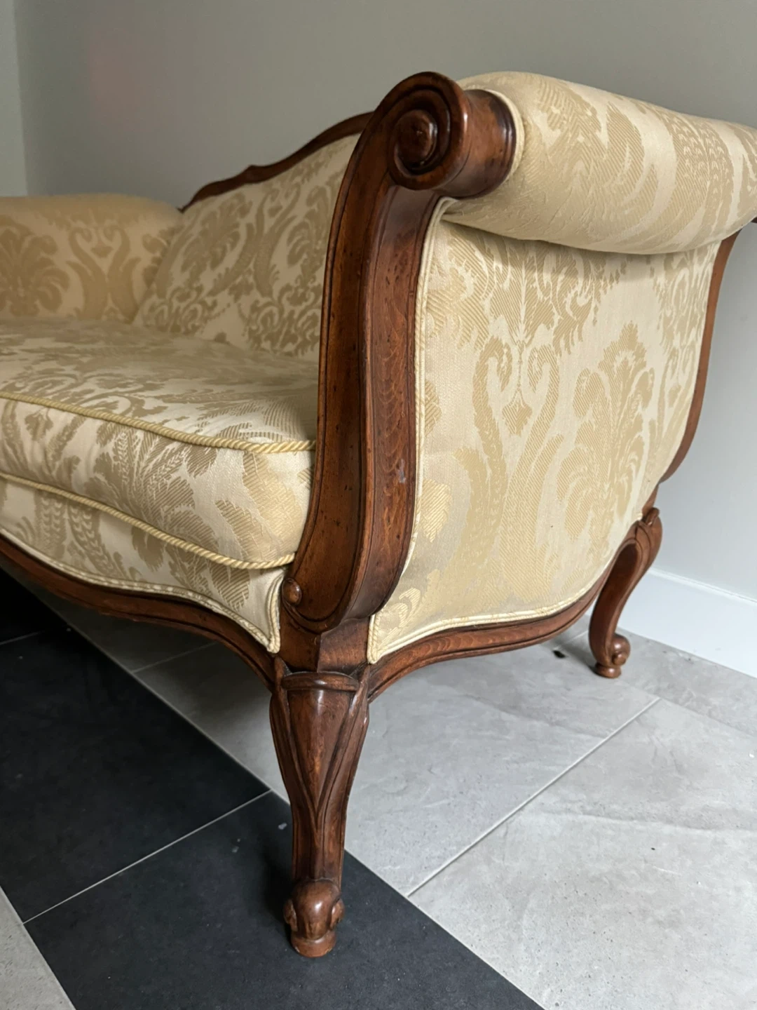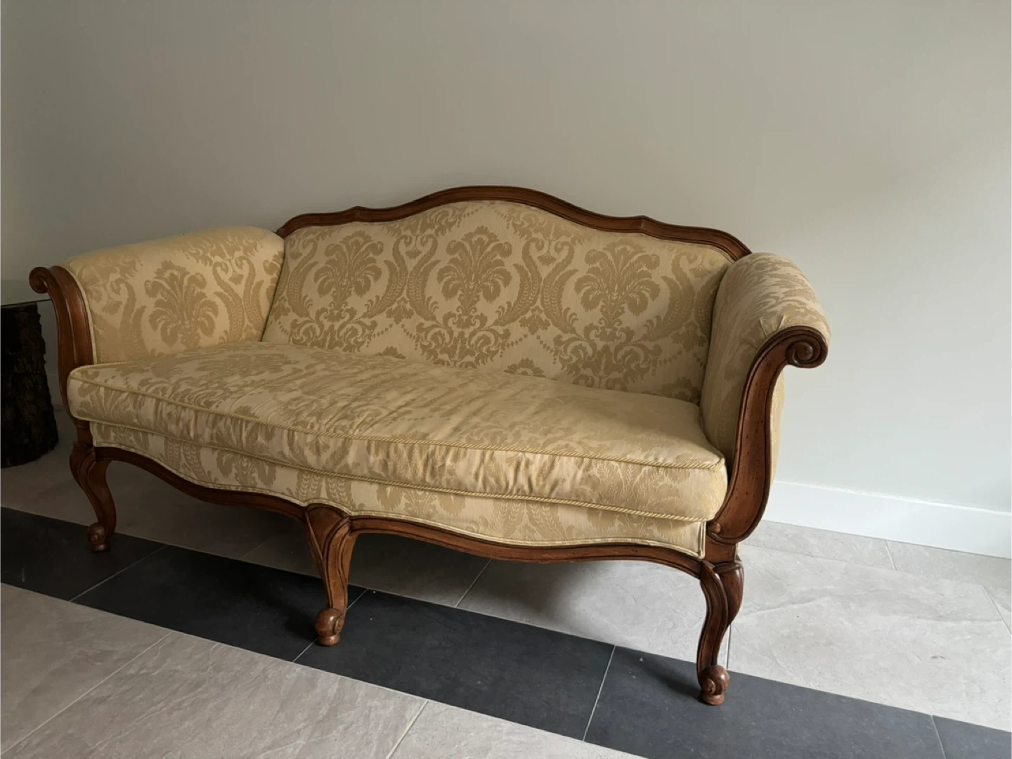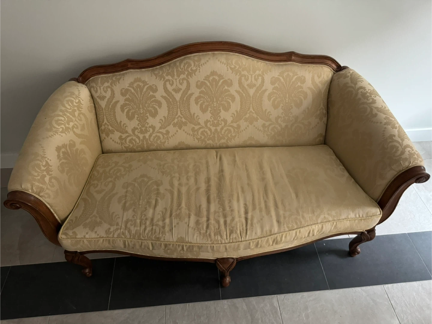 Selling a charming loveseat sofa with an antique-inspired design. It features a beige patterned fabric and elegant wood trim. Perfect for adding a touch of vintage style to your living room or seating area