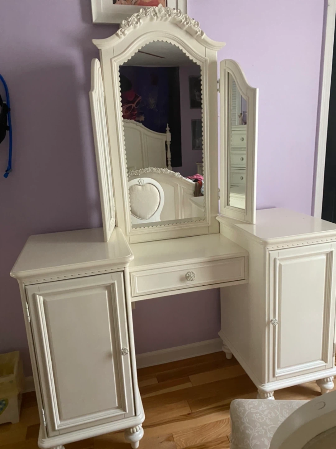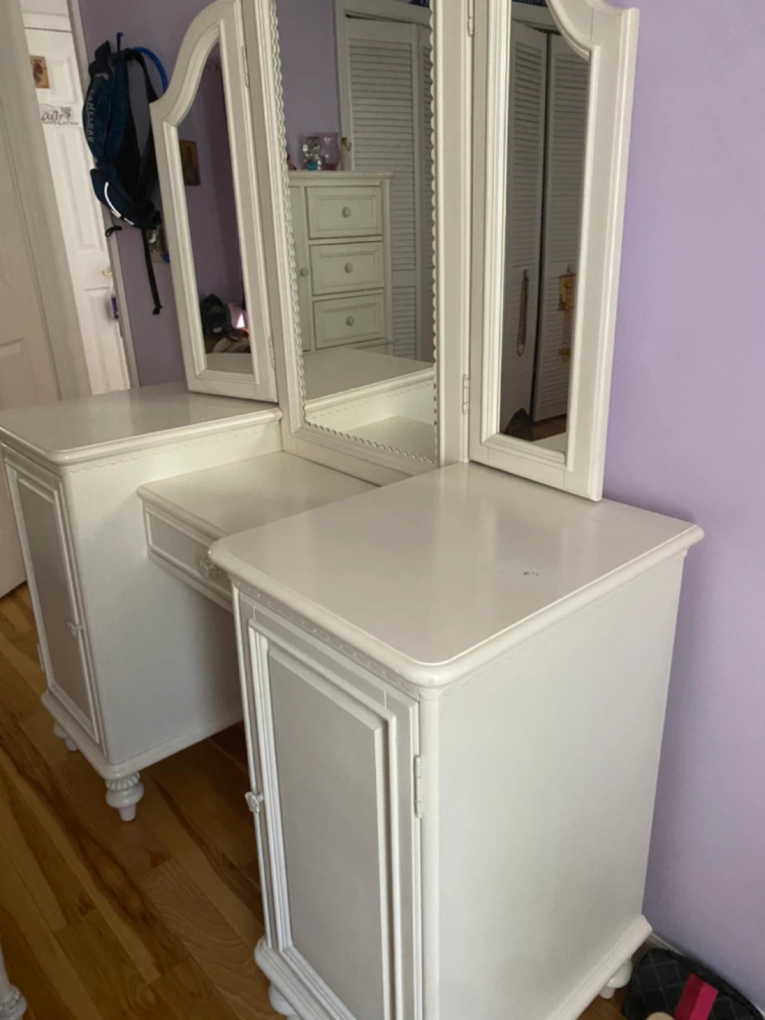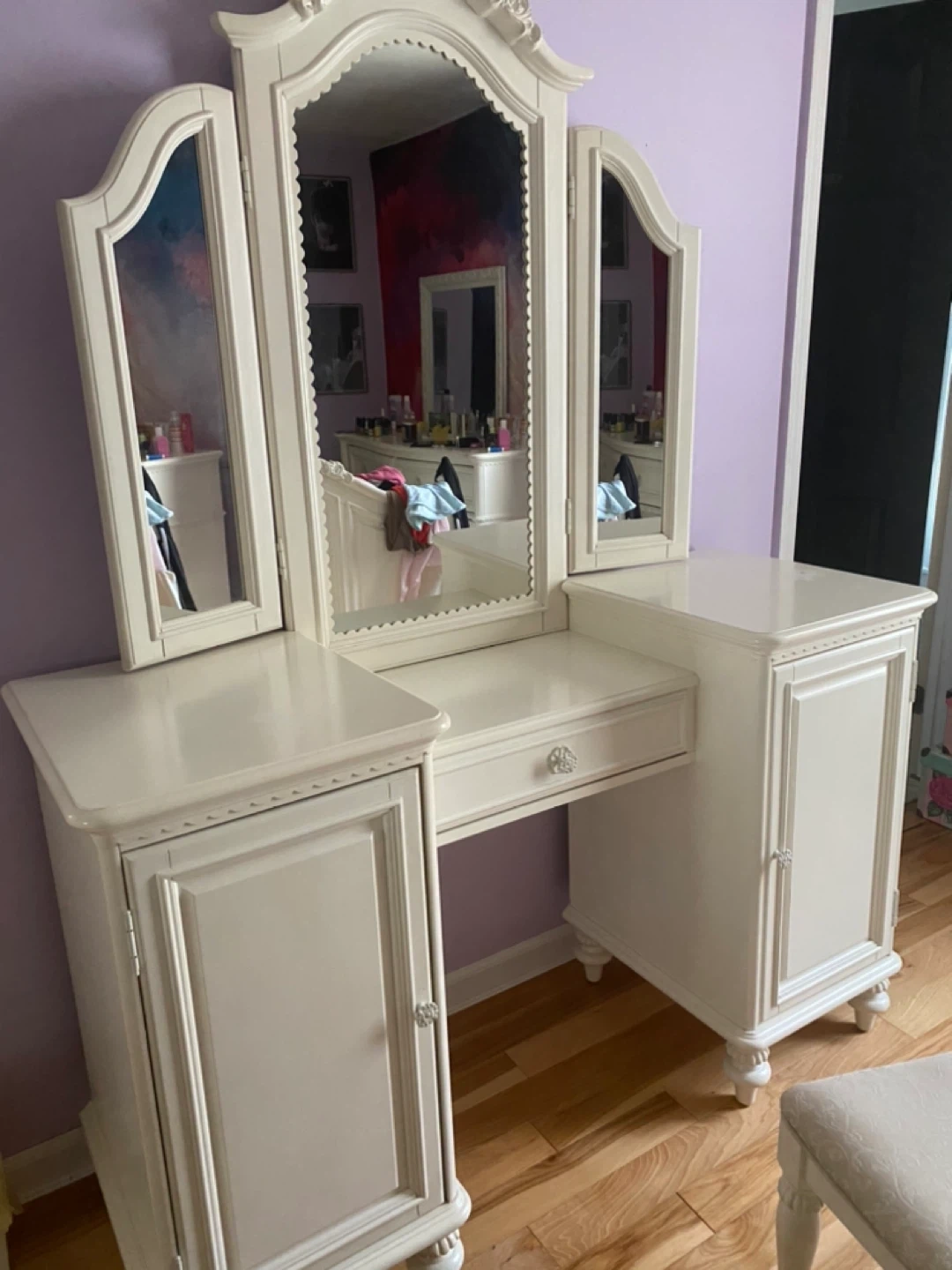 Selling a beautiful antique-style vanity set. It comes with a tri-fold mirror and a matching chair. The vanity is a lovely white color and would be perfect for a bedroom or dressing area. It features storage cabinets on either side and a drawer in the center. The chair has a patterned cushion.