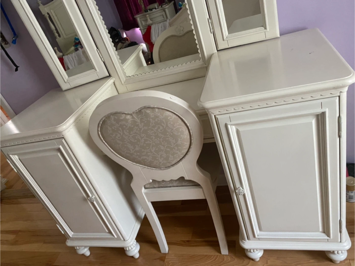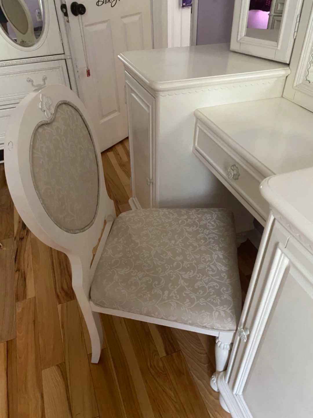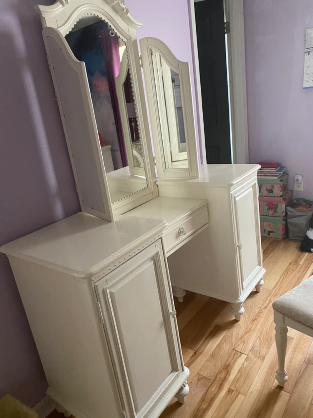 Selling a beautiful antique-style vanity set. It comes with a tri-fold mirror and a matching chair. The vanity is a lovely white color and would be perfect for a bedroom or dressing area. It features storage cabinets on either side and a drawer in the center. The chair has a patterned cushion.