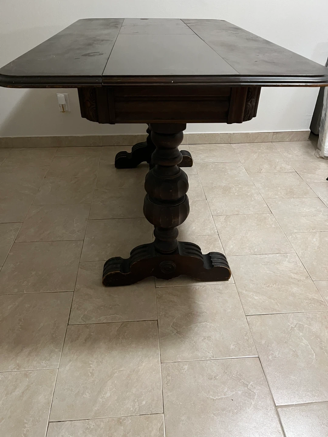 15Antique wood dining table/desk with pedestal base. It has a built in leaf that extends the table's width. Sturdy and functional.