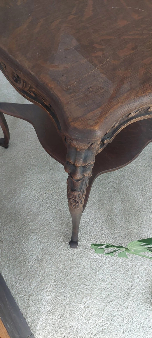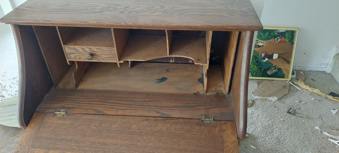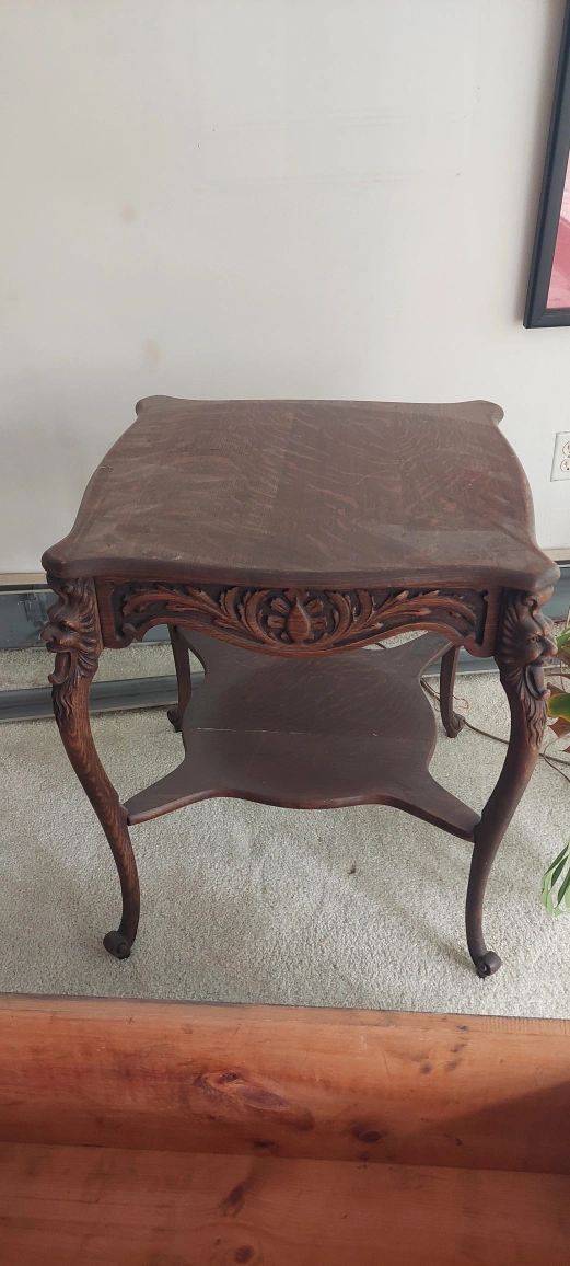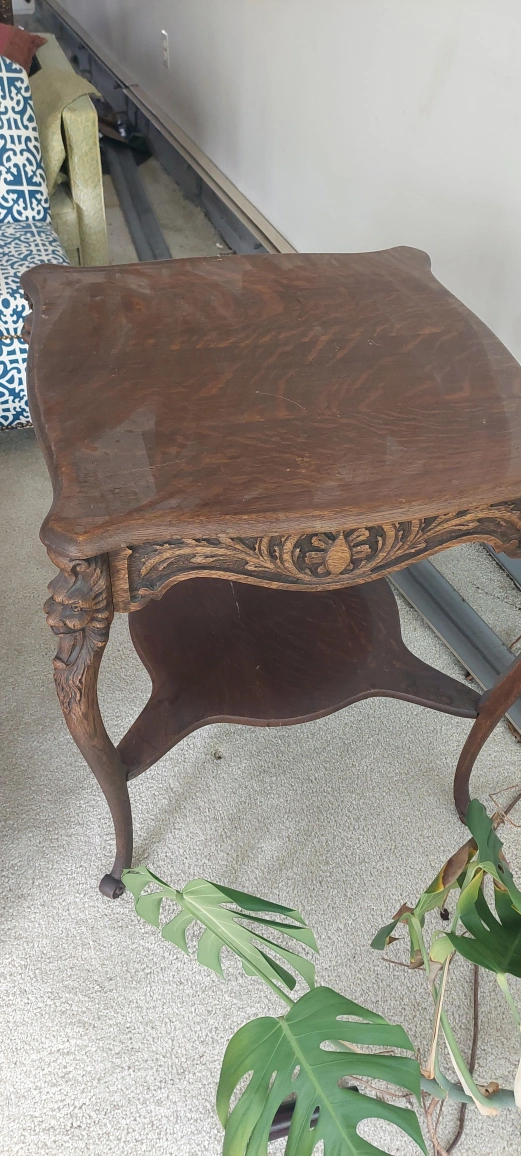 Selling an antique wood secretary desk and a matching side table. Both pieces show signs of wear consistent with their age, but they have a lot of character. The desk features a drop-down writing surface and several small compartments. The side table has a unique design with carved legs and a lower shelf