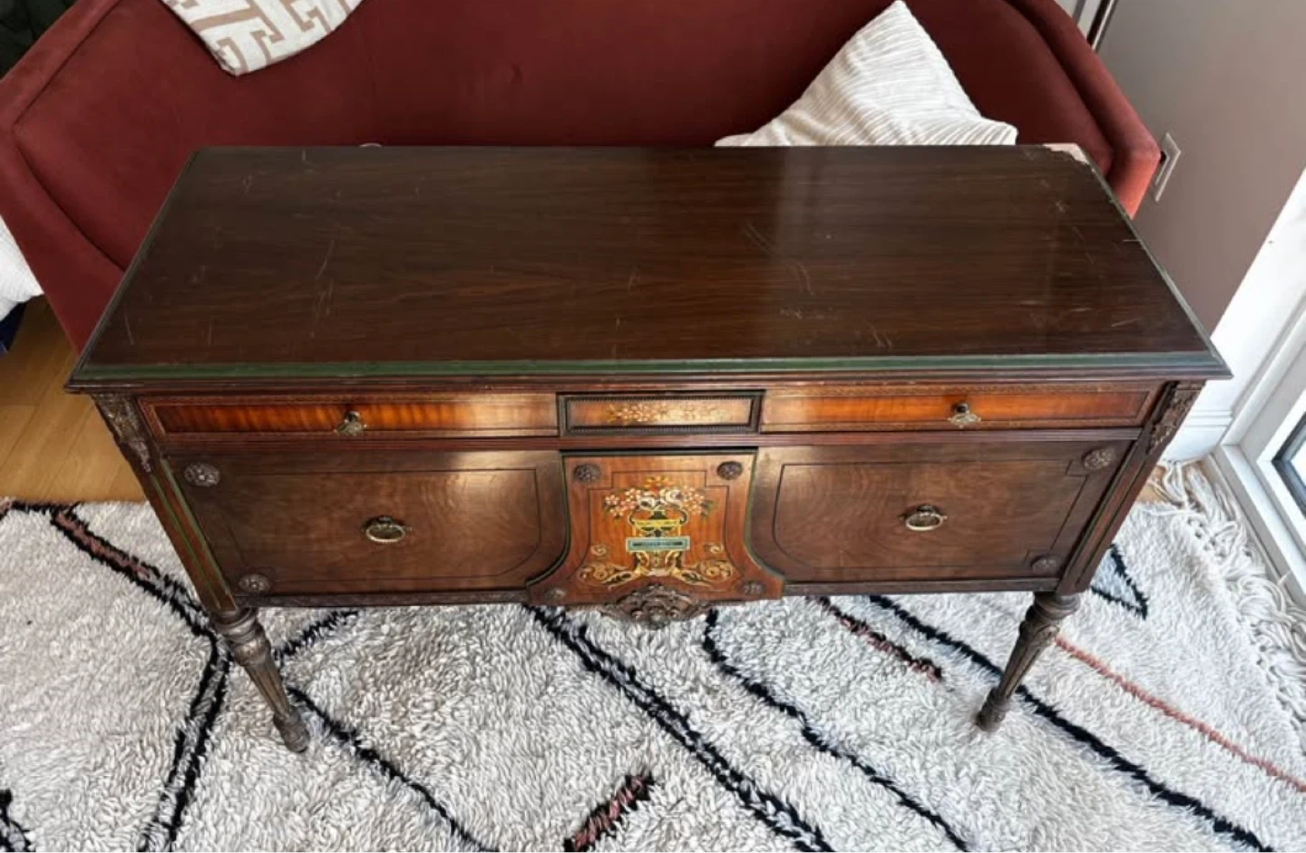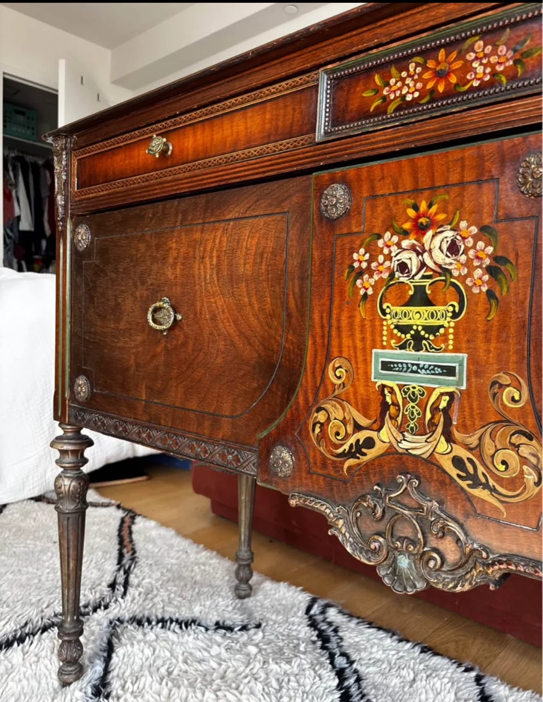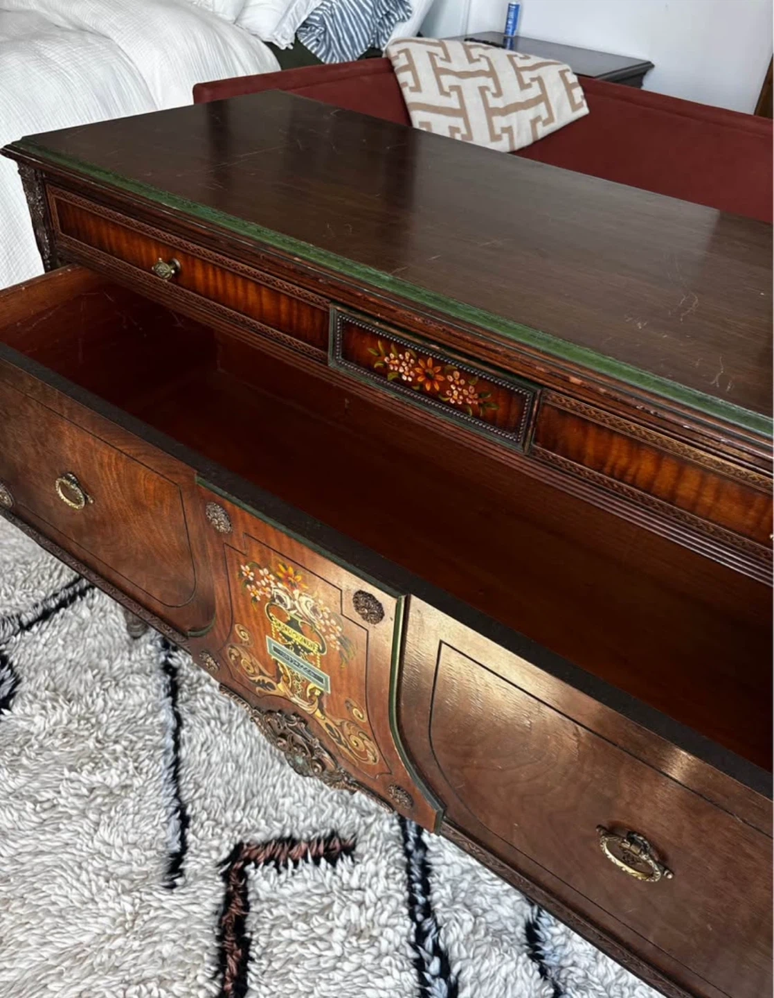 15Antique Rockford Peerless Furniture CO. Antique Hand-Painted Sideboard (c. 1910–1930) This elegant early 20th-century sideboard features rich hardwood construction with beautifully grained veneer and classic turned legs. The standout detail is the hand-painted floral and urn motif on the center panel, framed by intricate carvings and marquetry. With two drawers, it offers both style and storage. Brass hardware and decorative trim complete the vintage charm—perfect for a dining room or statement piece in any space. Originally going for over $2000, discounted significantly due to scratches and markings shown in the photos. Such a beautiful statement piece! Dimensions: L-48 H-33 D-18 CAN DELIVER