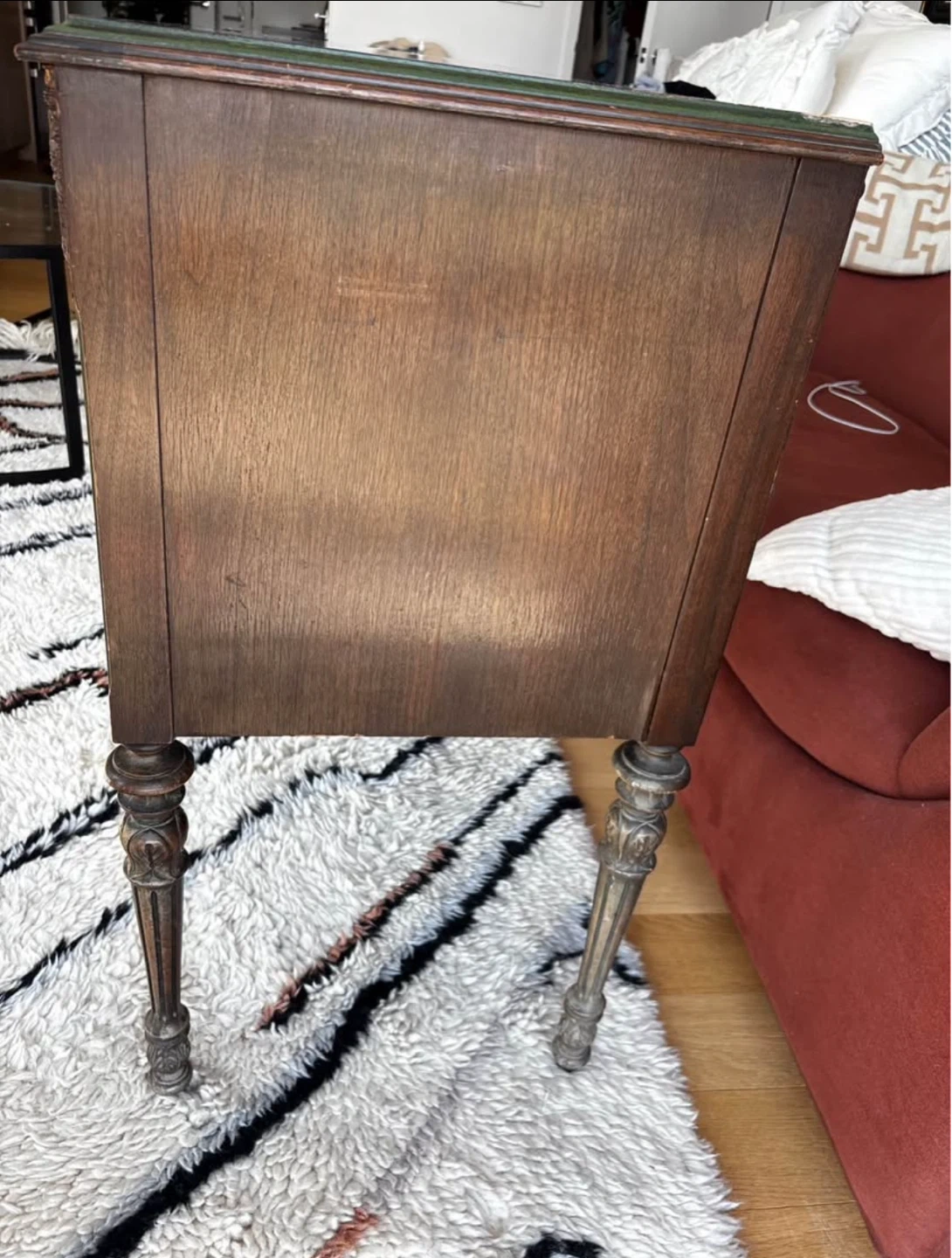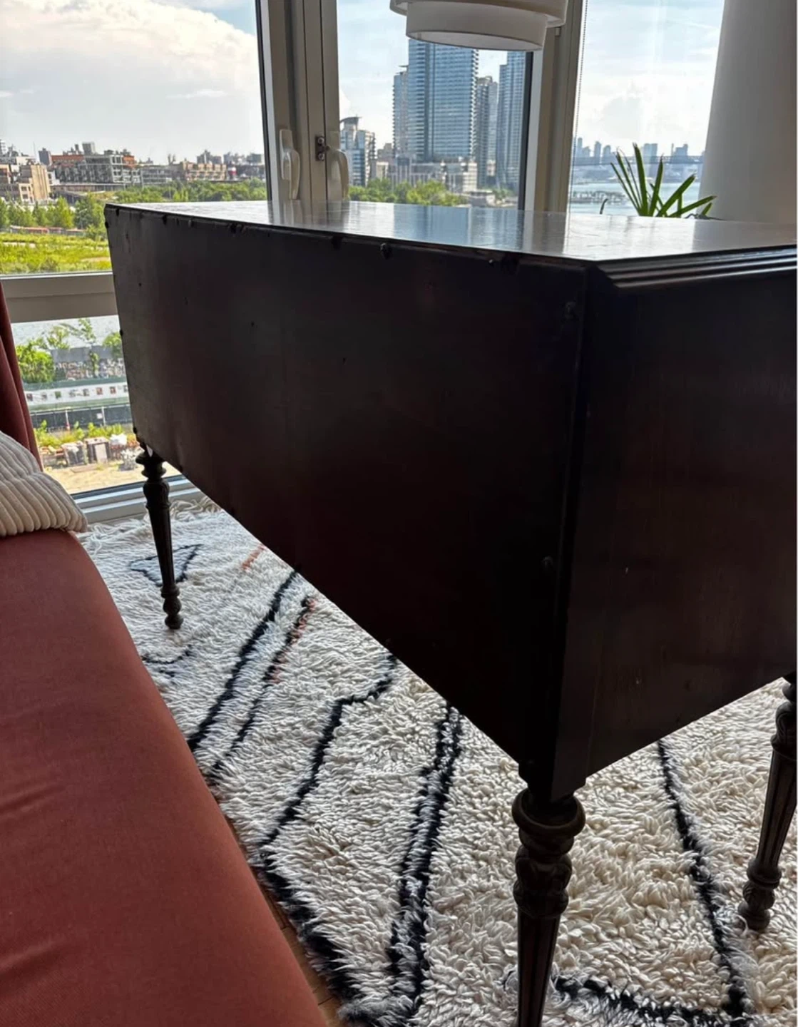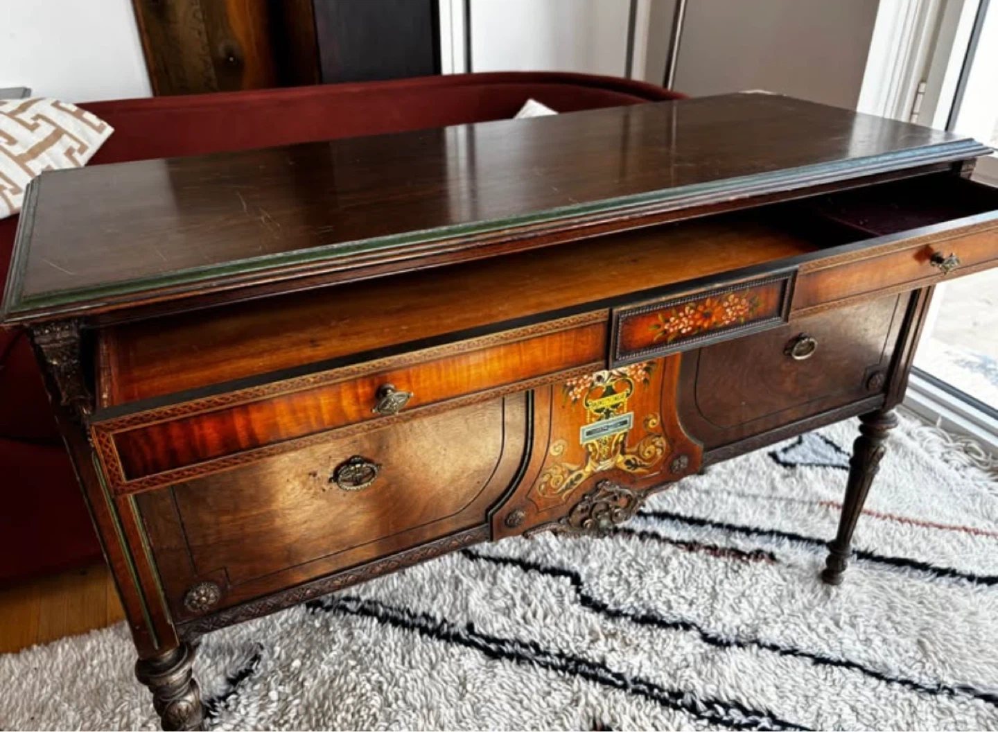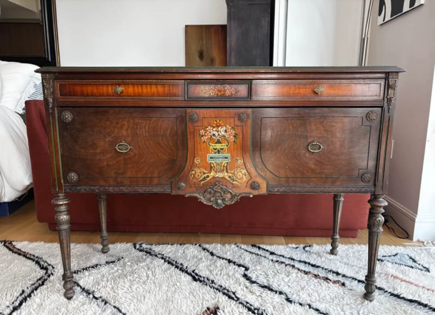 15Antique Rockford Peerless Furniture CO. Antique Hand-Painted Sideboard (c. 1910–1930) This elegant early 20th-century sideboard features rich hardwood construction with beautifully grained veneer and classic turned legs. The standout detail is the hand-painted floral and urn motif on the center panel, framed by intricate carvings and marquetry. With two drawers, it offers both style and storage. Brass hardware and decorative trim complete the vintage charm—perfect for a dining room or statement piece in any space. Originally going for over $2000, discounted significantly due to scratches and markings shown in the photos. Such a beautiful statement piece! Dimensions: L-48 H-33 D-18 CAN DELIVER