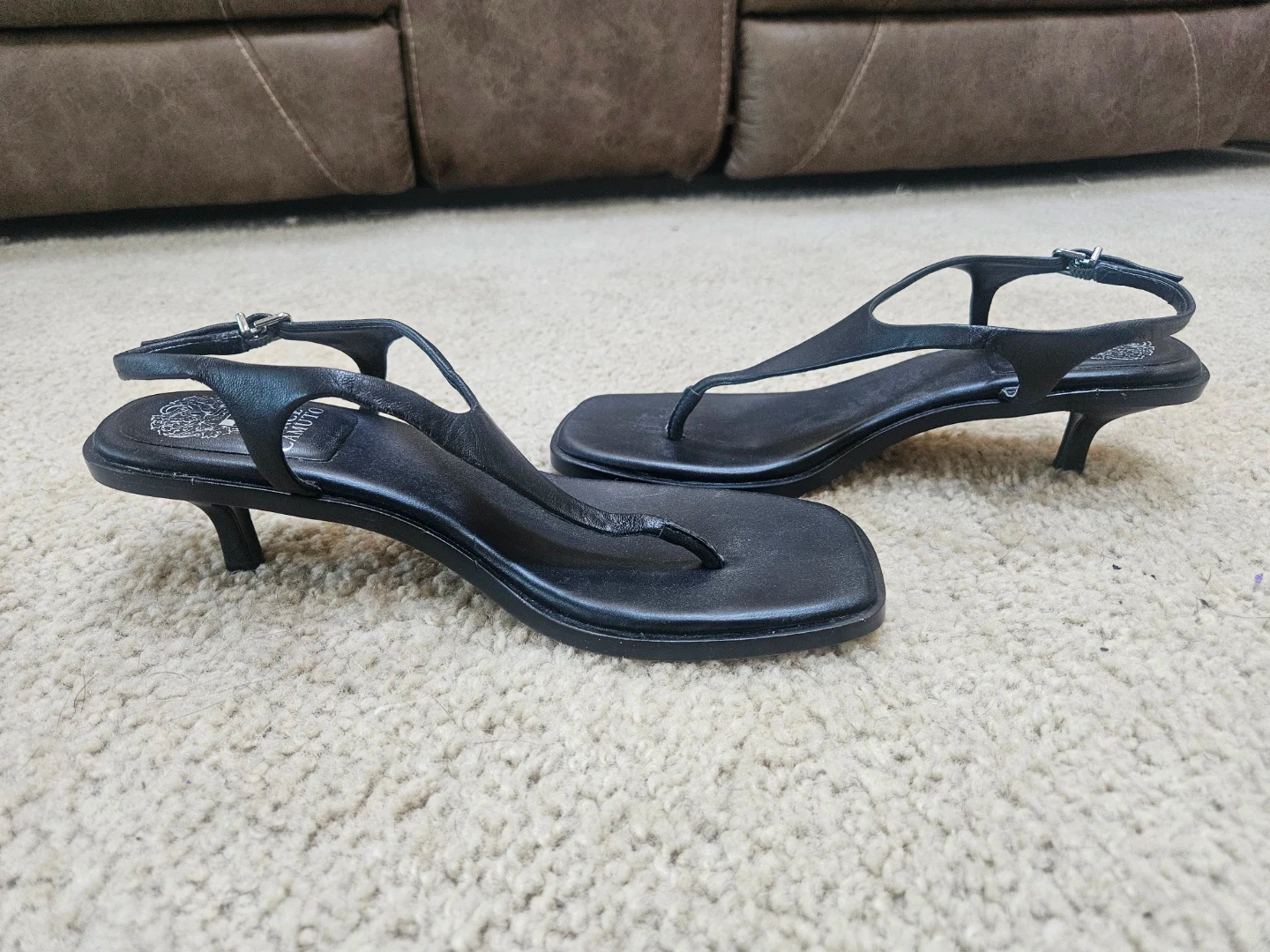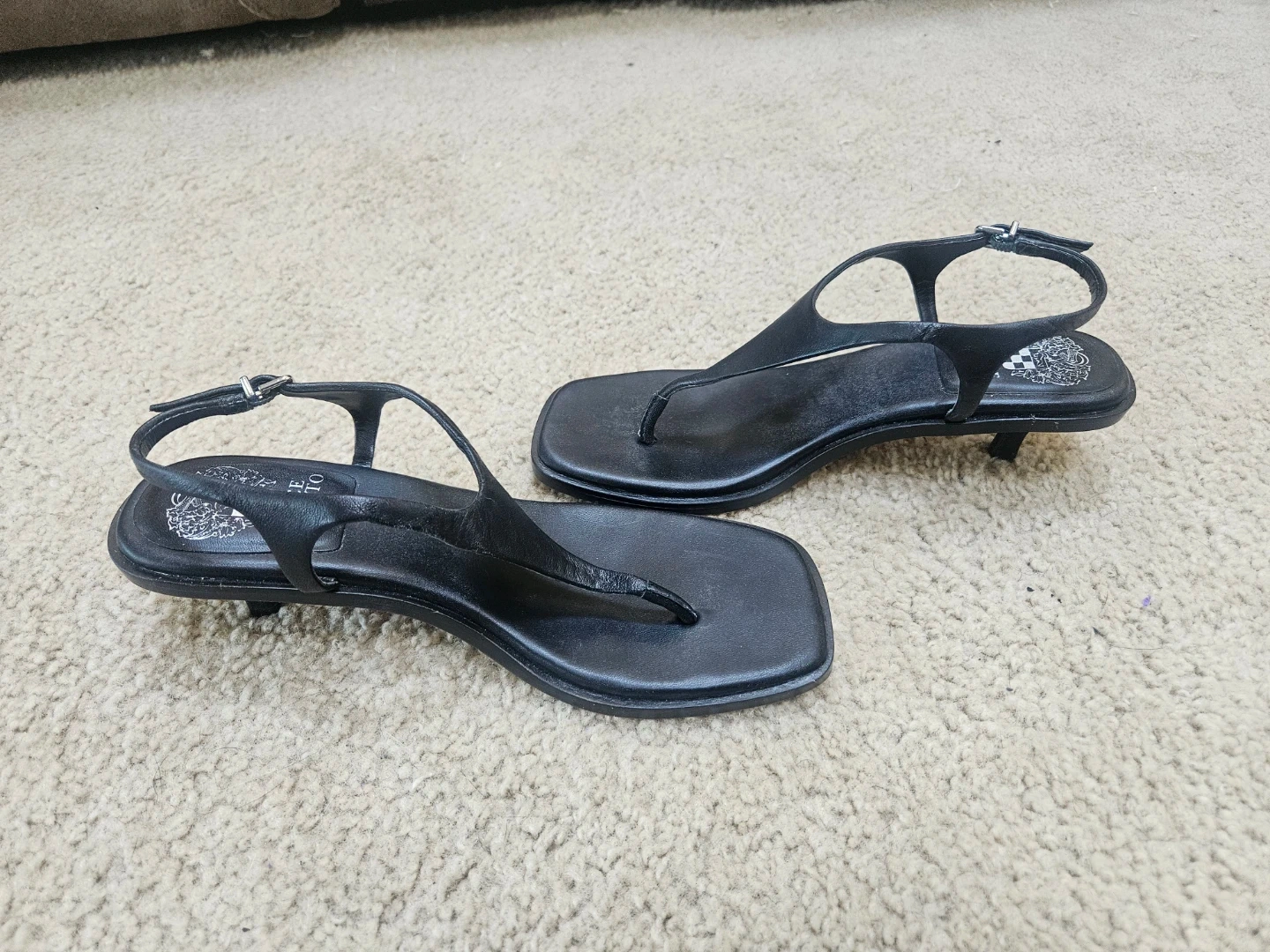 Vince Camuto black thong heeled sandals. Features a secure ankle strap with buckle closure. Leather material.