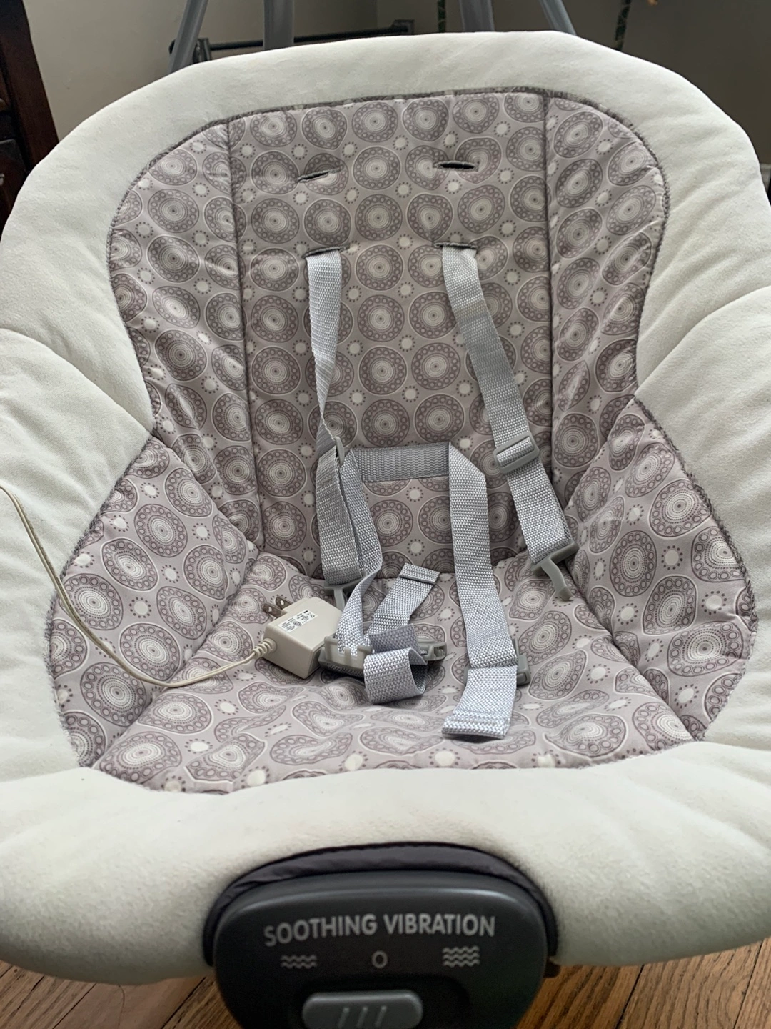 Baby swing, stationary. Soothing vibrations. Gray and white pattern. Includes mobile with turtle toys. Gently used in pet-free home.