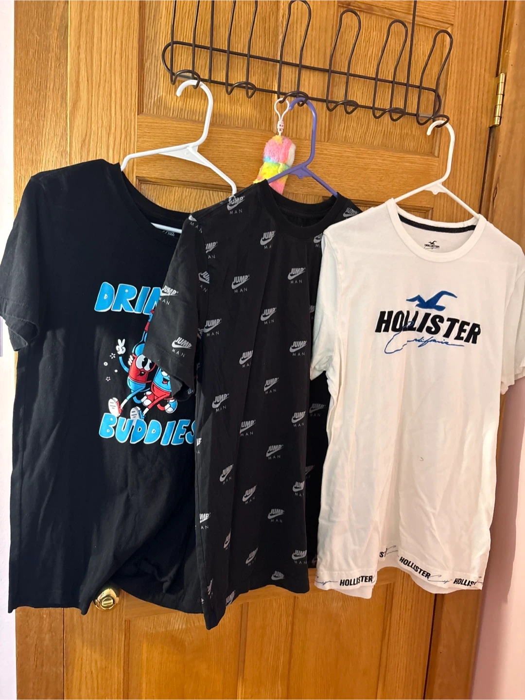 This lot includes three t-shirts. One is a white Hollister t-shirt with its logo and California text. Another is a black t-shirt with a repeating 'JUMP MAN' pattern. The third is a black graphic tee with 'DRINK BUDDIES' text and cartoon characters. Cotton material.