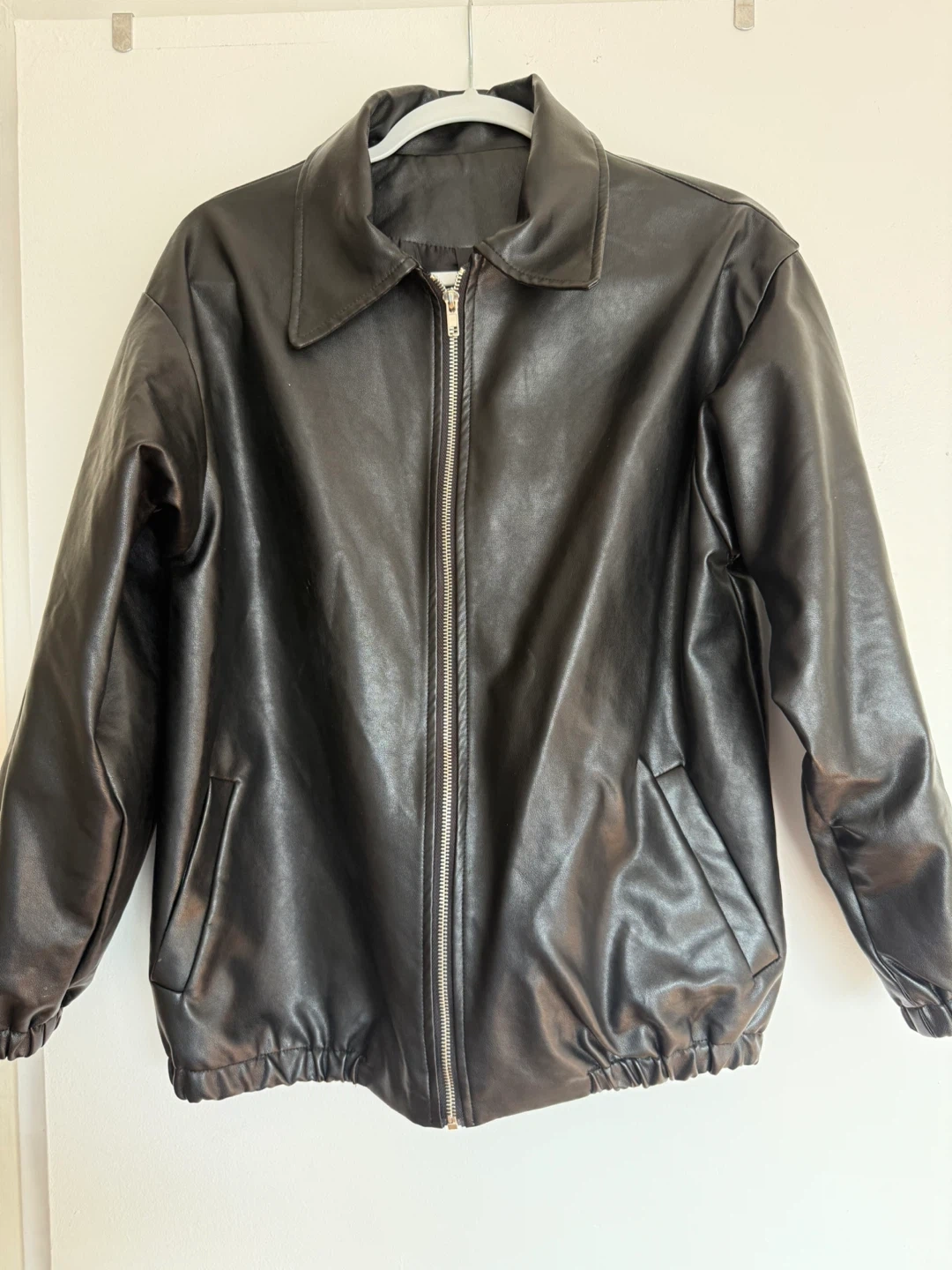 Here's a stylish black faux leather jacket! It's in great condition and features a classic design with a zipper closure and pockets. Perfect for adding a touch of edge to any outfit