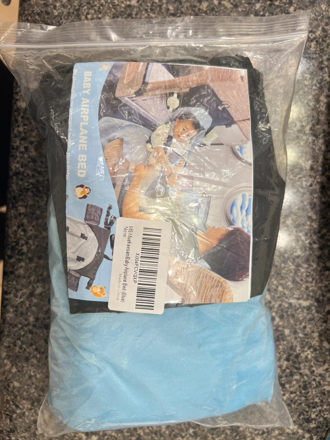 I have a brand new baby airplane bed still in its original packaging! It's blue and black, and ready to make your next flight with your little one much more comfortable