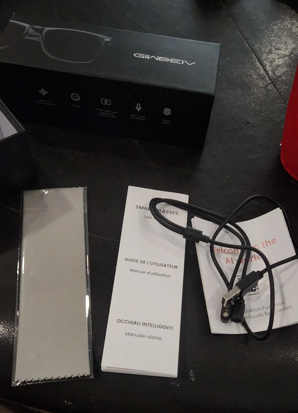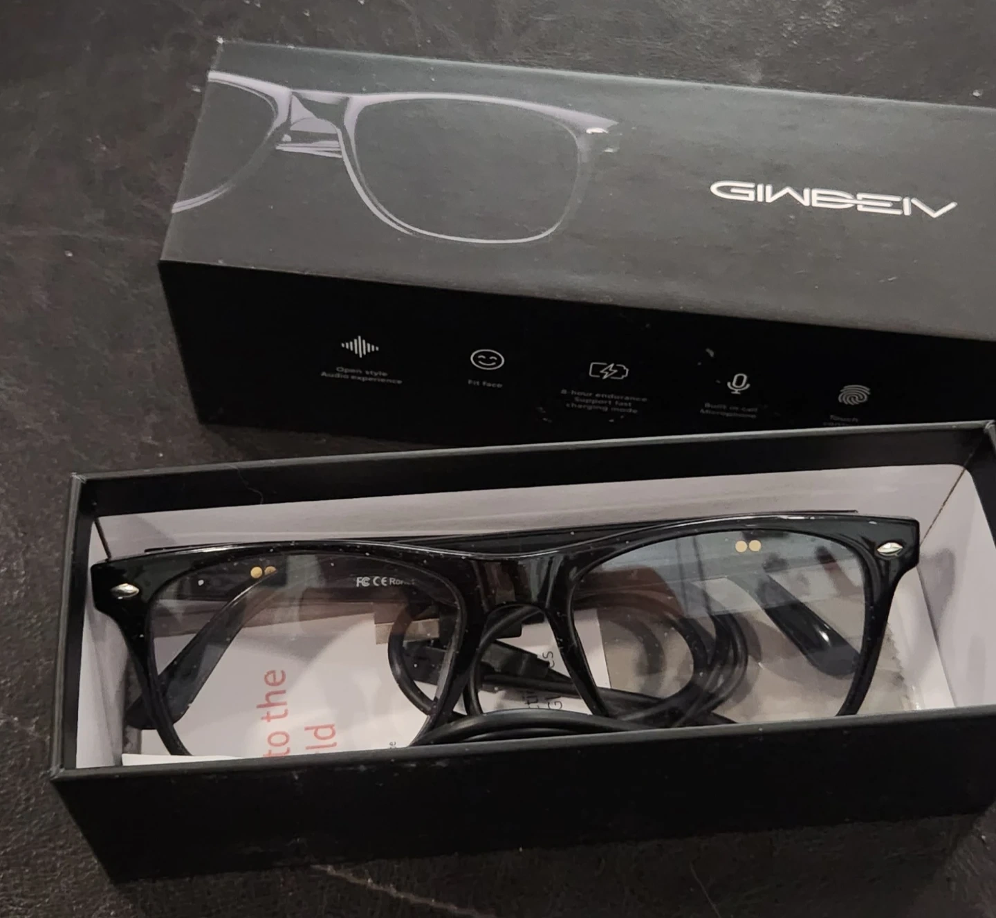 These GIWEIV smart glasses offer an open-style audio experience. They feature a built-in microphone and touch controls for calls. The glasses provide 8-hour endurance and support charging mode. Includes original packaging and user manual.
