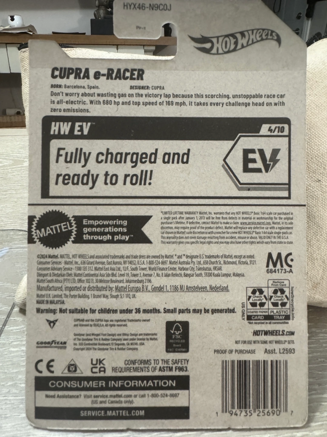 Selling a Hot Wheels Cupra e-Racer! This die-cast car is all-electric. It's fully charged and ready to roll! The packaging says it's new for 2025. It's a great addition to any Hot Wheels collection