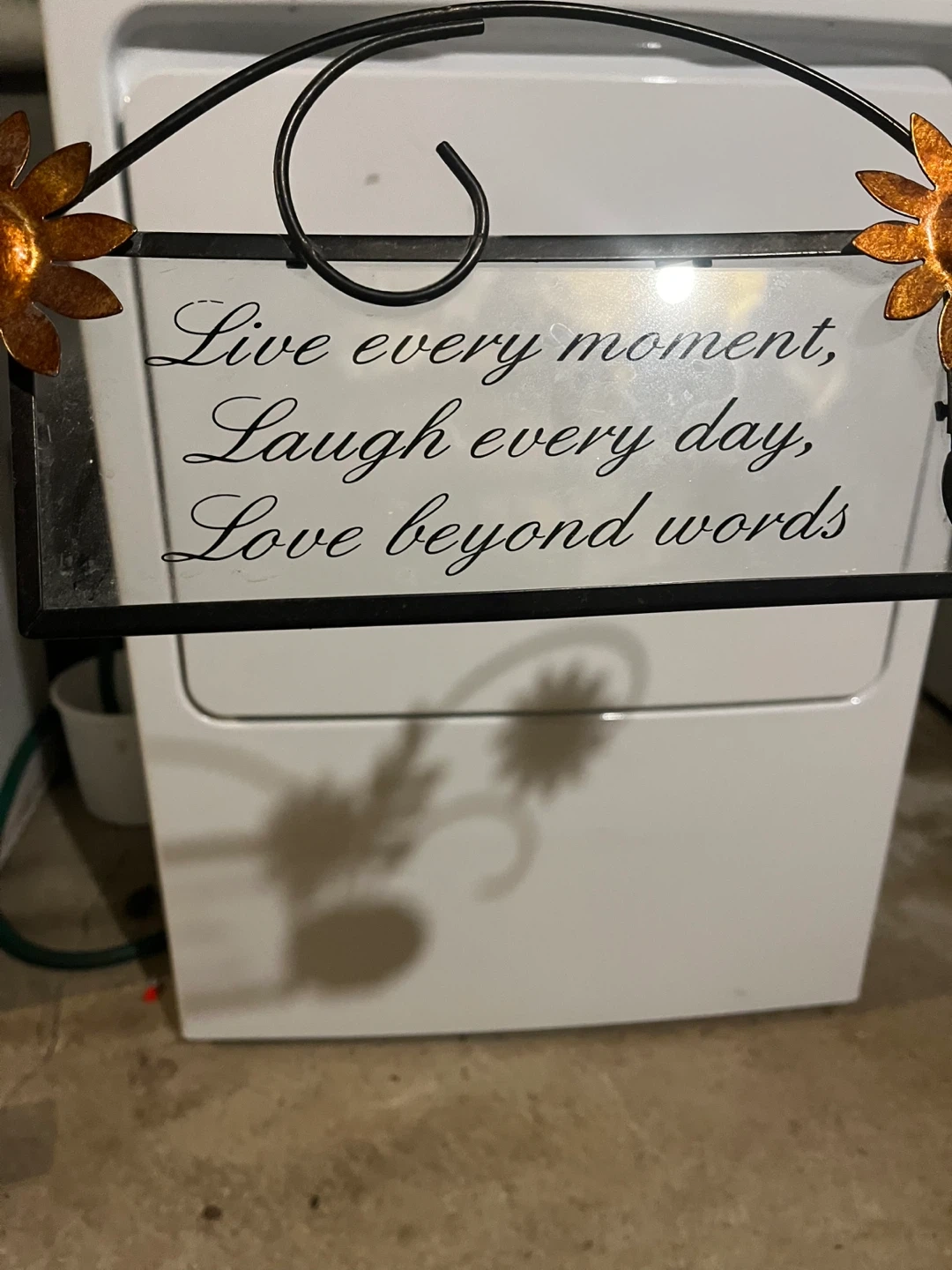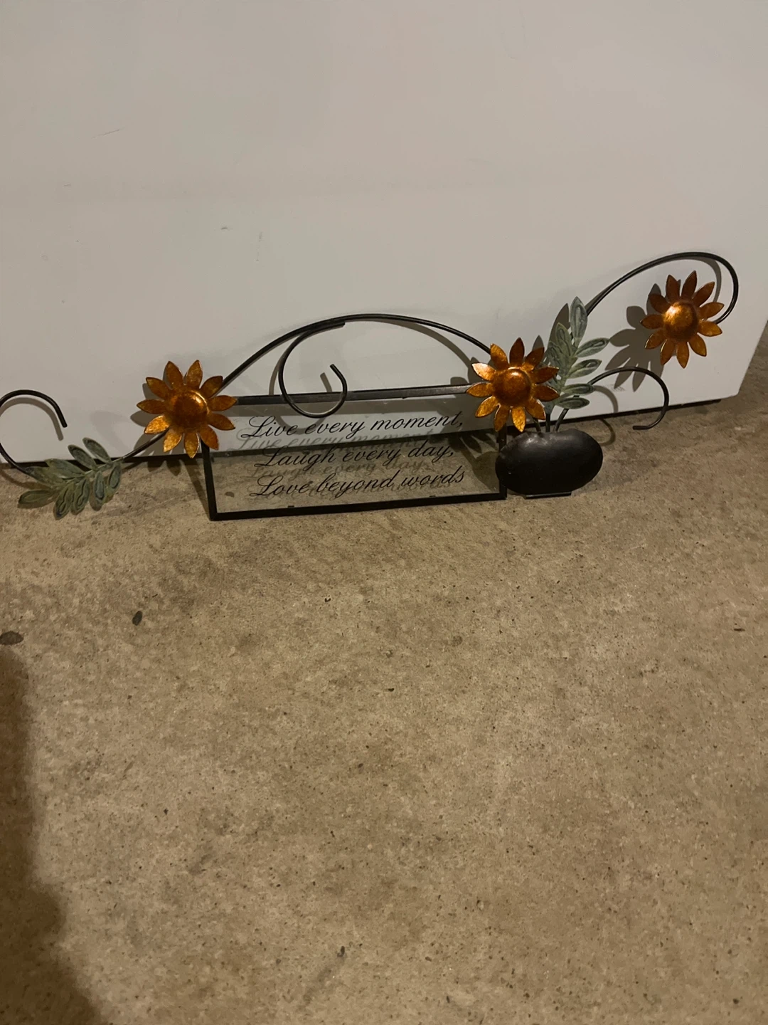 This metal wall plaque features a decorative floral design with three orange flowers and green leaves. It also includes a glass panel with the quote 'Live every moment, Laugh every day, Love beyond words' in elegant script. It's a charming piece for home decor!
