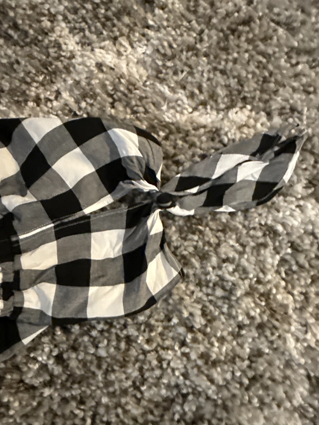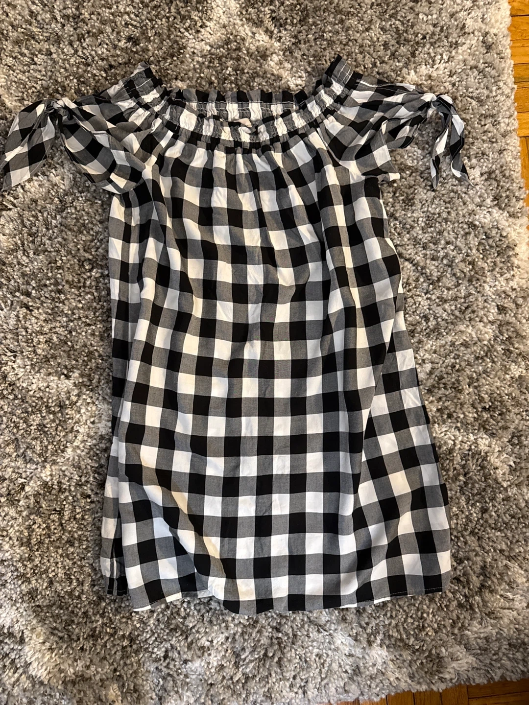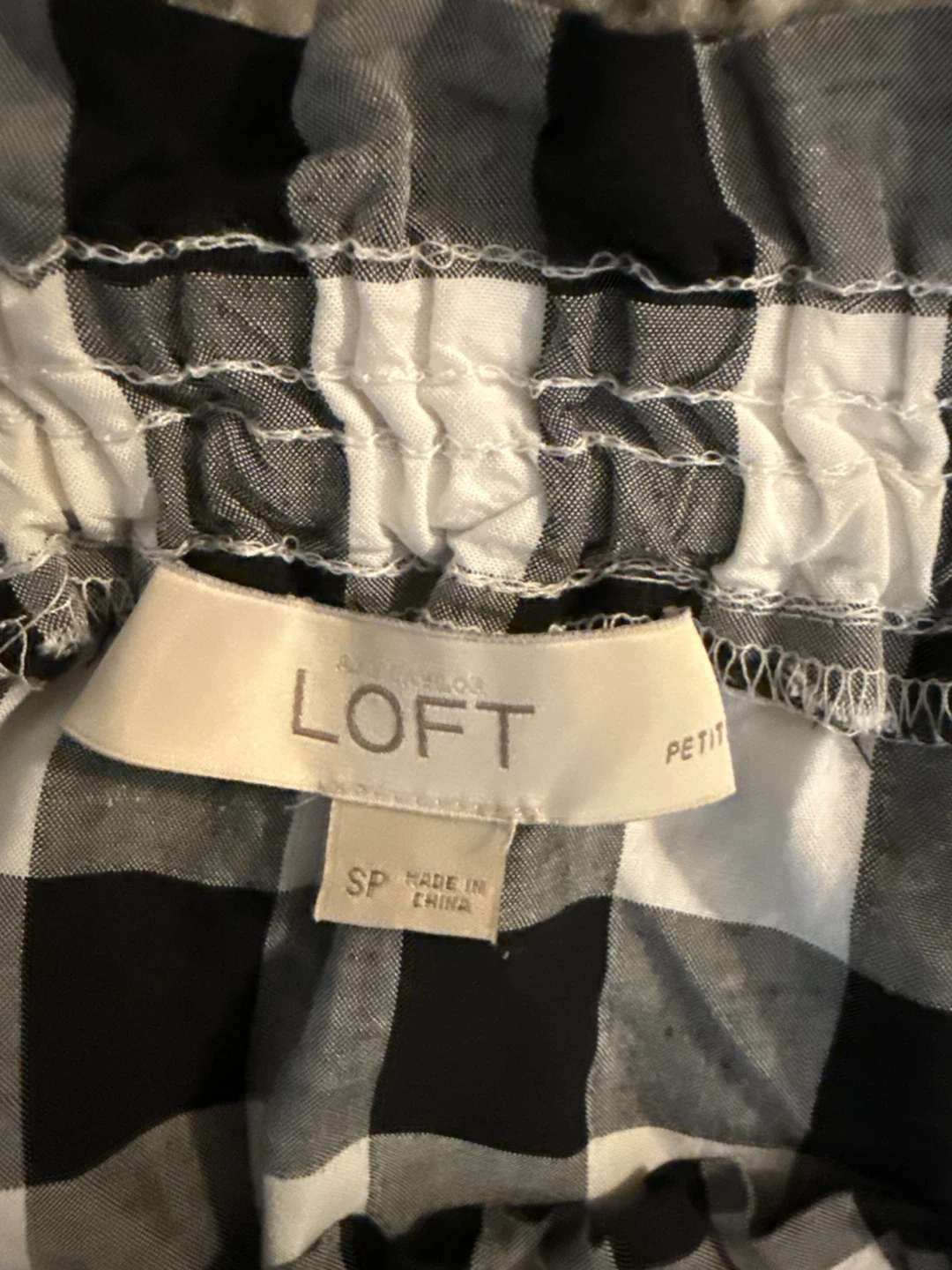 Black and white gingham off-the-shoulder top from LOFT. It's a petite small size with tie details on the sleeves. Made in China.