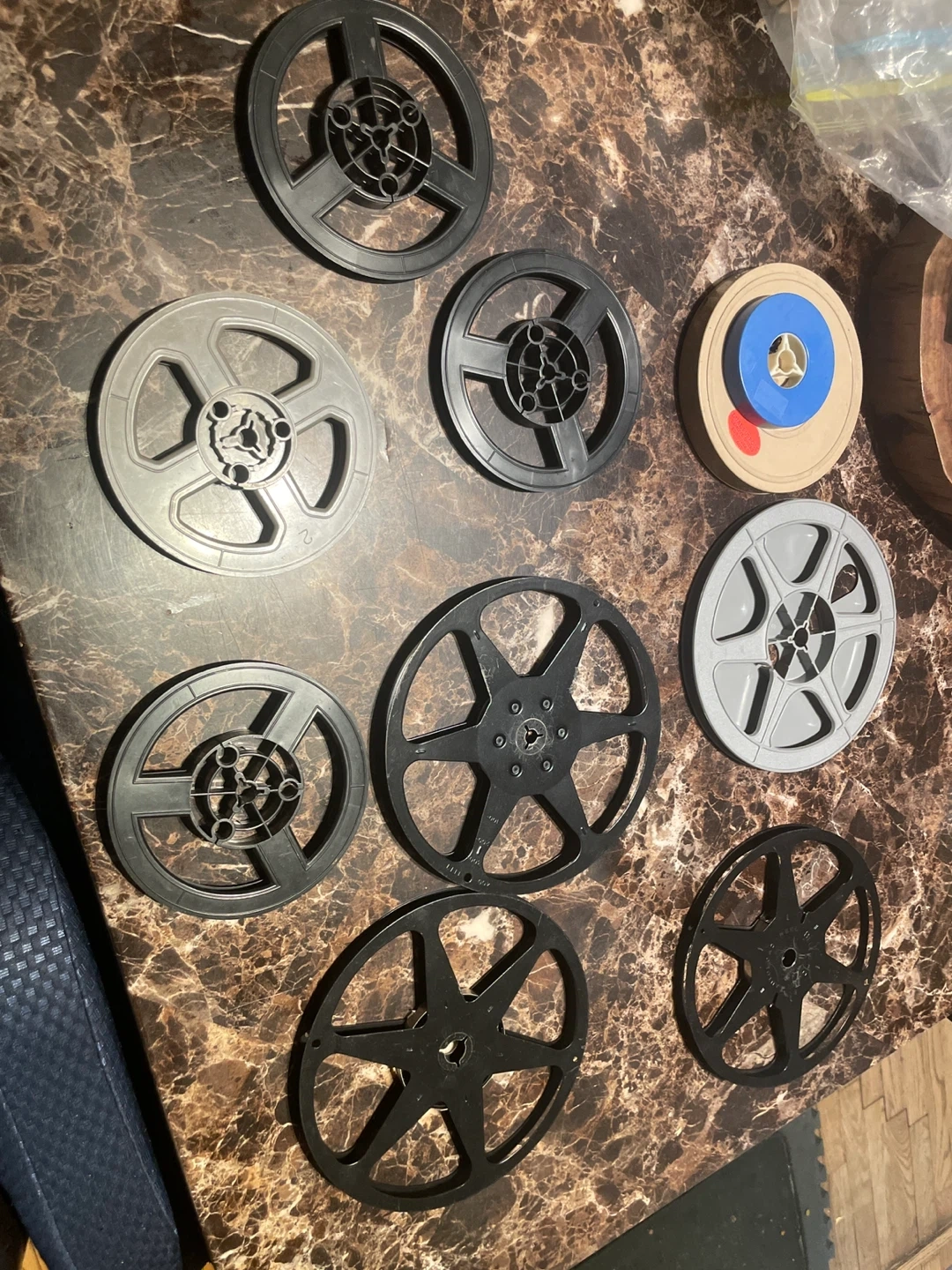 This is a lot of 9 film reels in various sizes and colors, including black and gray. Some reels have tape and a red and blue indicator. They appear to be made of plastic.