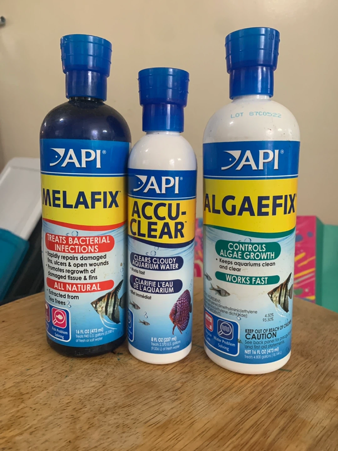 59I have three bottles of API aquarium treatments for sale: Melafix, Algaefix, and Accu-Clear. They are designed to treat bacterial infections, control algae growth, and clear cloudy aquarium water. Each bottle contains 16 fl oz (473 ml) of Melafix, 8 fl oz (237 ml) of Accu-Clear, and 16 fl oz (473 ml) of Algae fix