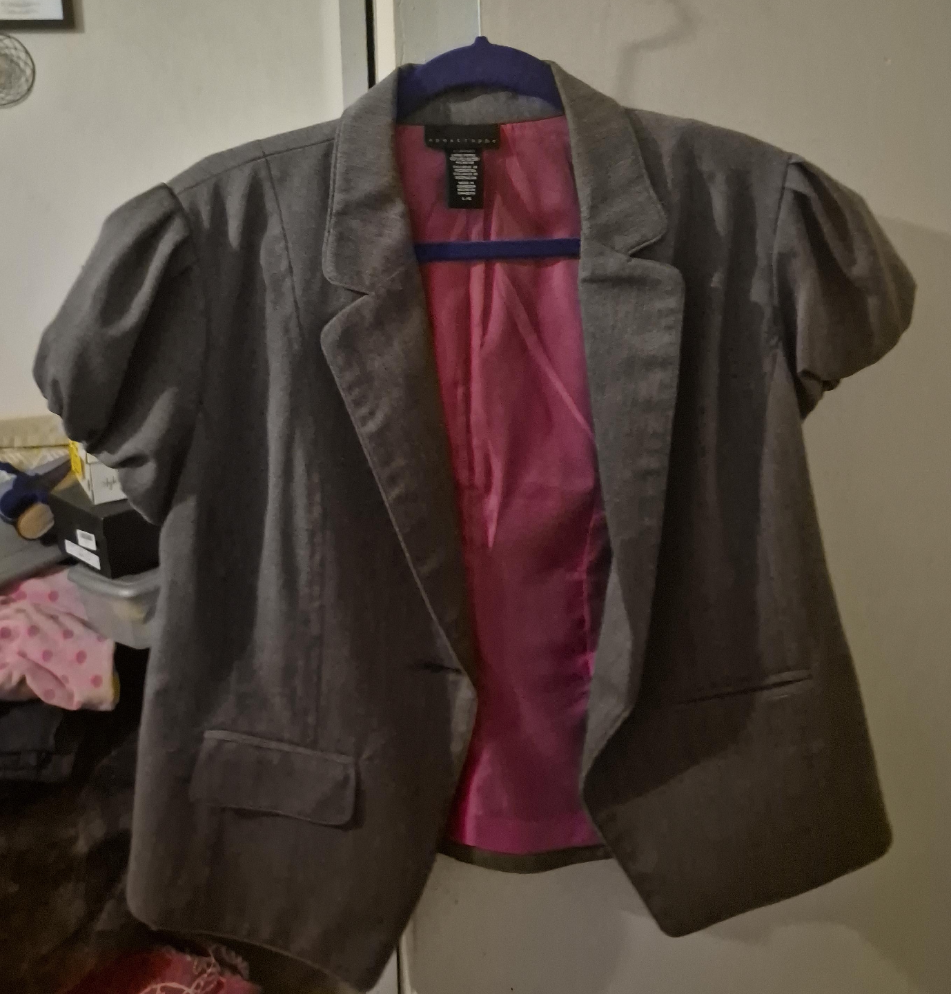 86Here's a gray short sleeve blazer from Apostrophe! It has a pink lining. Perfect for a business casual look!
