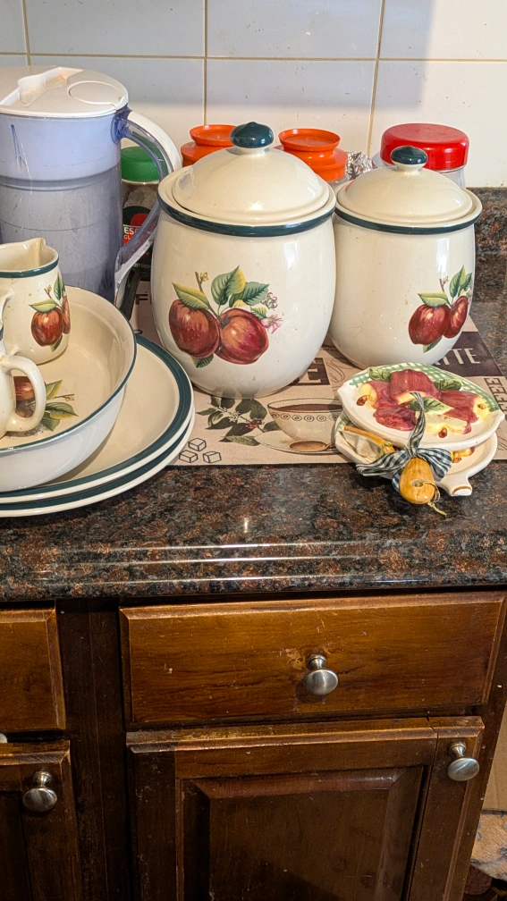 I'm selling a set of kitchen canisters and dishes with an apple design. They're in great condition and would look great in any kitchen! The set includes two canisters, two plates, two bowls, and two mugs