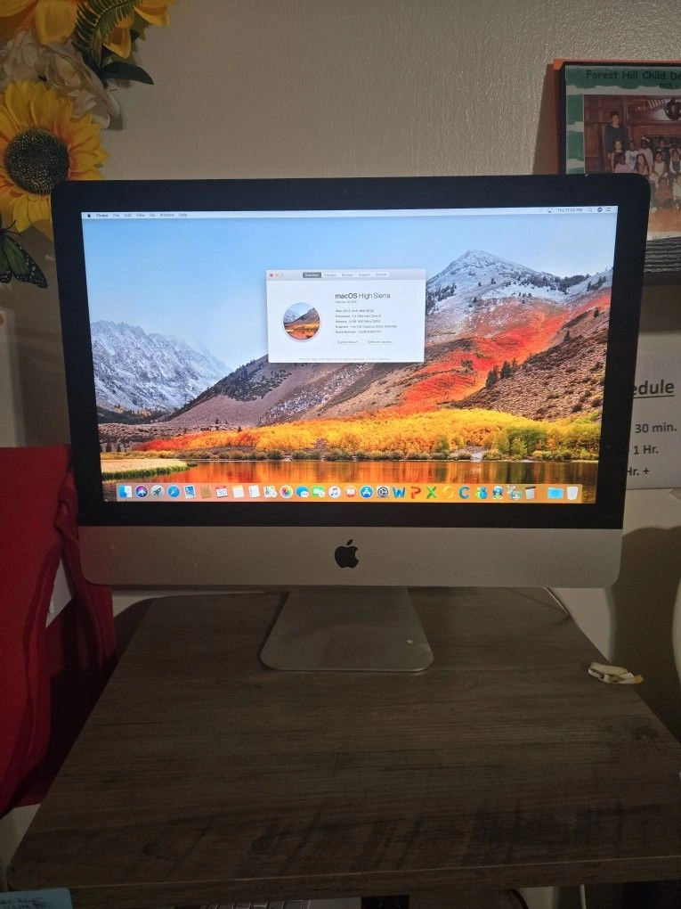 60iMac 21.5 in. 1.4Ghz i5 processor 8Gb Ram 500Gb HD Intel HD Graphics 5000. 1536MB High Sierra OS. Comes with keyboard and power cord ** NO MOUSE** SN: C02NV4MFFY0T Model: IMac Brand: Apple