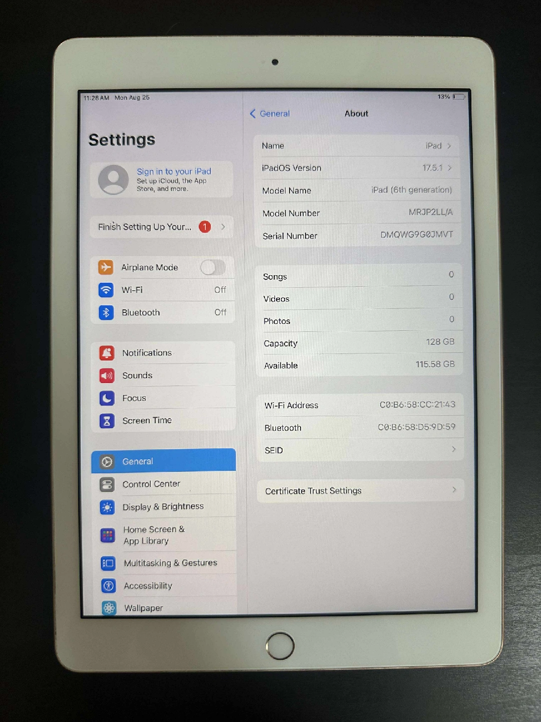Selling a gold Apple iPad (6th generation) with 128GB of storage. The model number is MRJP2LL/A. It's in great condition and ready for a new owner!