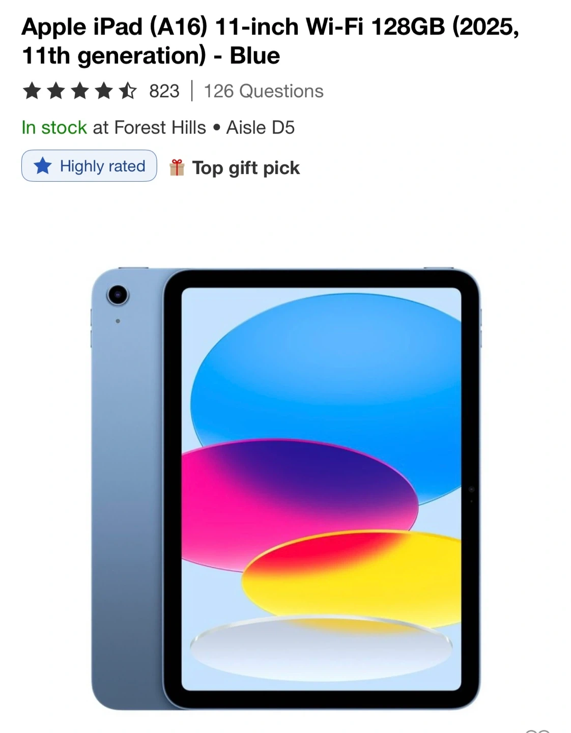 150Selling a blue Apple iPad (A16) 11-inch Wi-Fi with 128GB of storage. This is the 11th generation model. You can use to study, work and play whatever you want. New condition in the box and it unboxed just brought it and I’m reselling it rn!