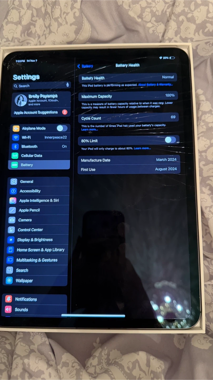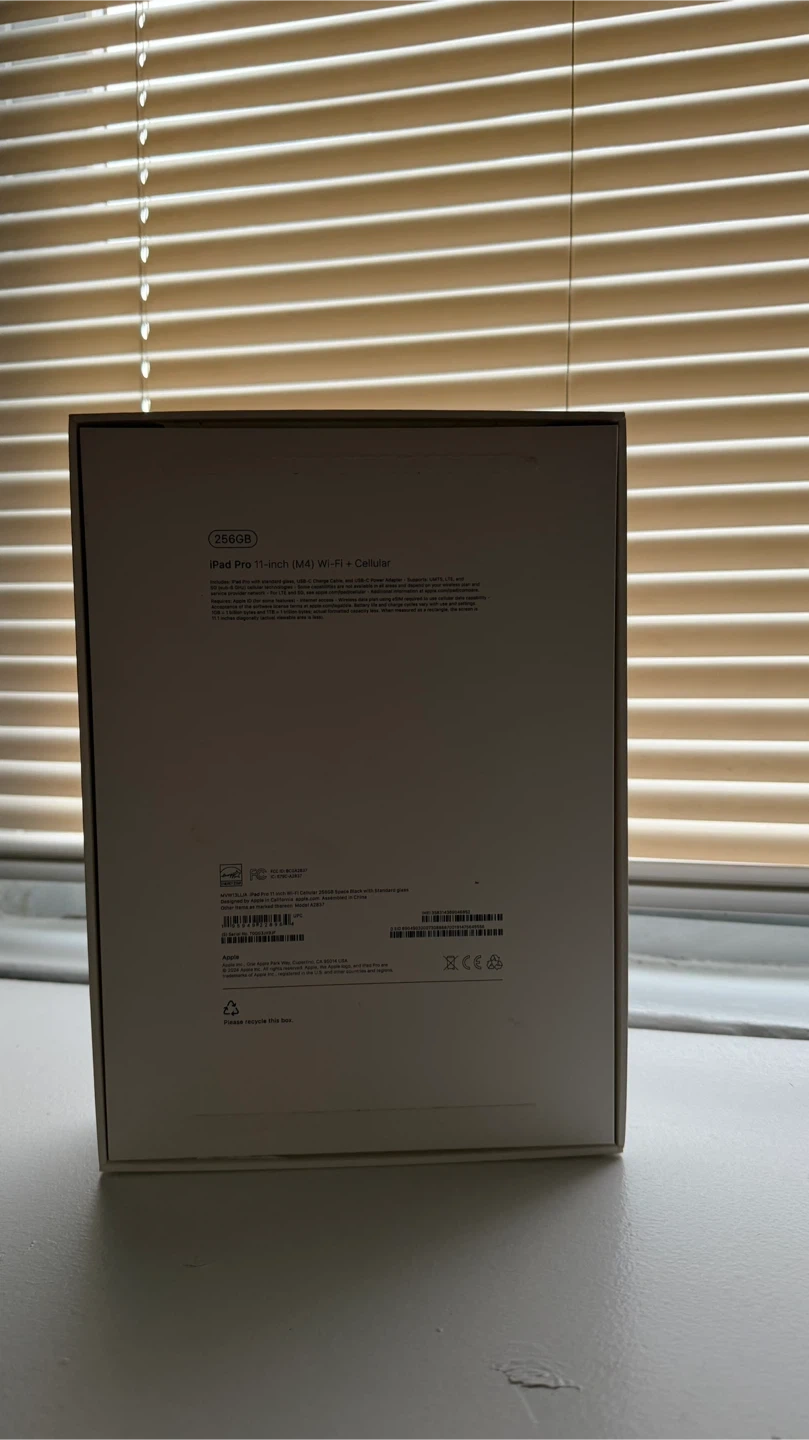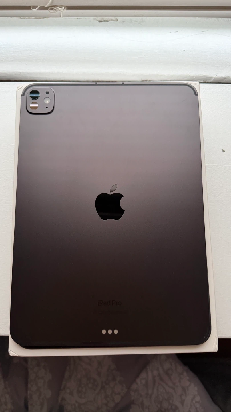 65Description: Selling my iPad Pro 11” M4 (2024), 256GB, Space Black. 💯 Works perfectly — battery 100% health, Face ID, touchscreen, camera, sound — everything functions like new. 🔹 The screen has a thin surface crack on the top area (see photo). It’s purely cosmetic and doesn’t affect the display or touch response at all. I had it checked at Apple, and they confirmed there’s no internal damage. Includes the original box and charger. Manufactured March 2024, first use in August 2024.
