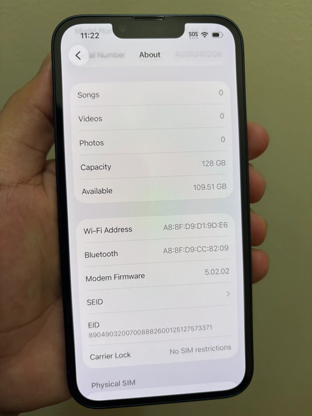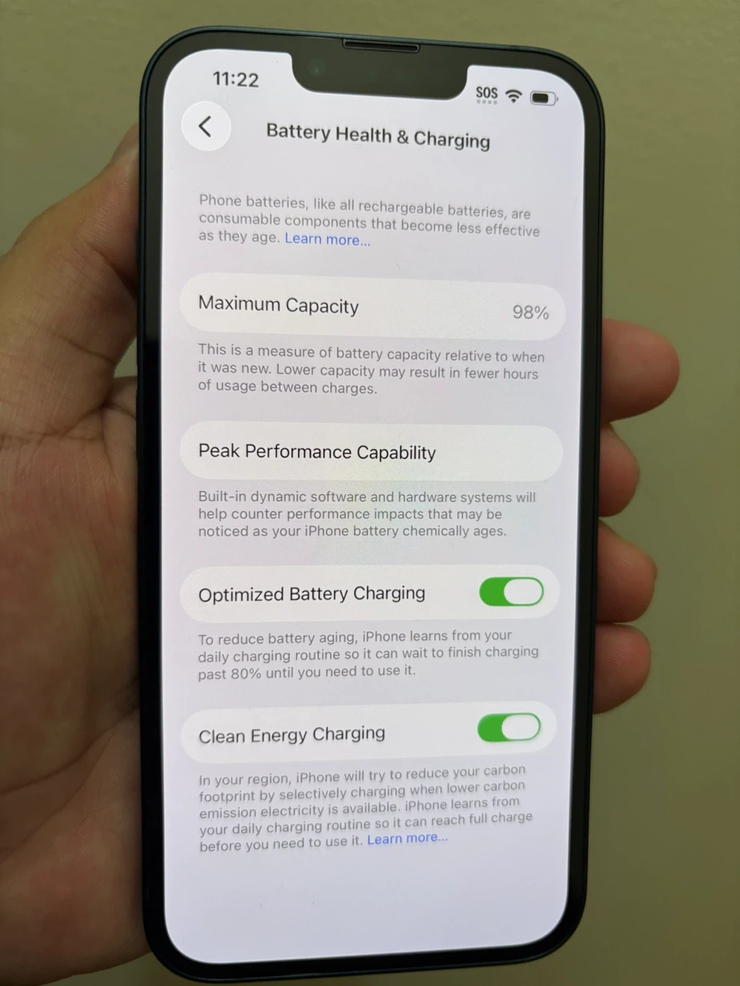 101Selling an iPhone 13 in blue with 128GB of storage. The battery health is at 98%. It's in great condition!