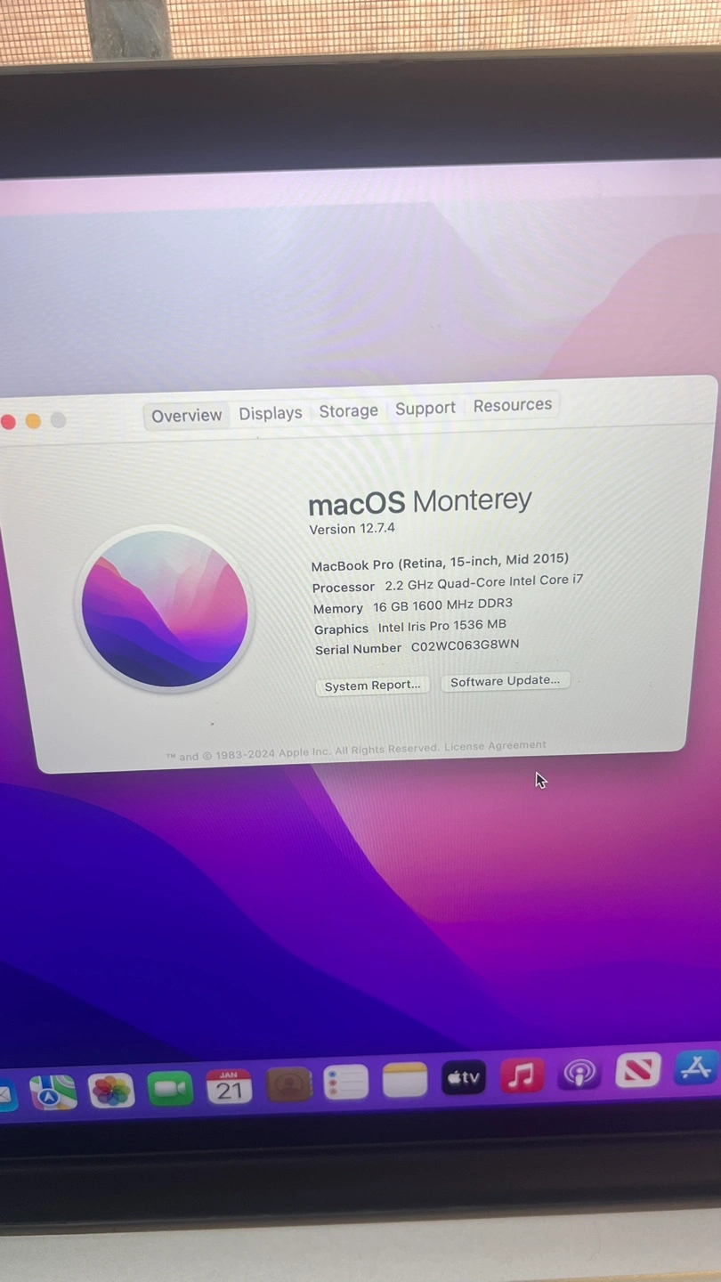 MacBook Pro 15-inch, Mid 2015 model. macOS Monterey installed. 2.2 GHz Quad-Core Intel Core i7 processor. 16 GB memory. 500 GB flash storage. Intel Iris Pro 1536 MB graphics.
