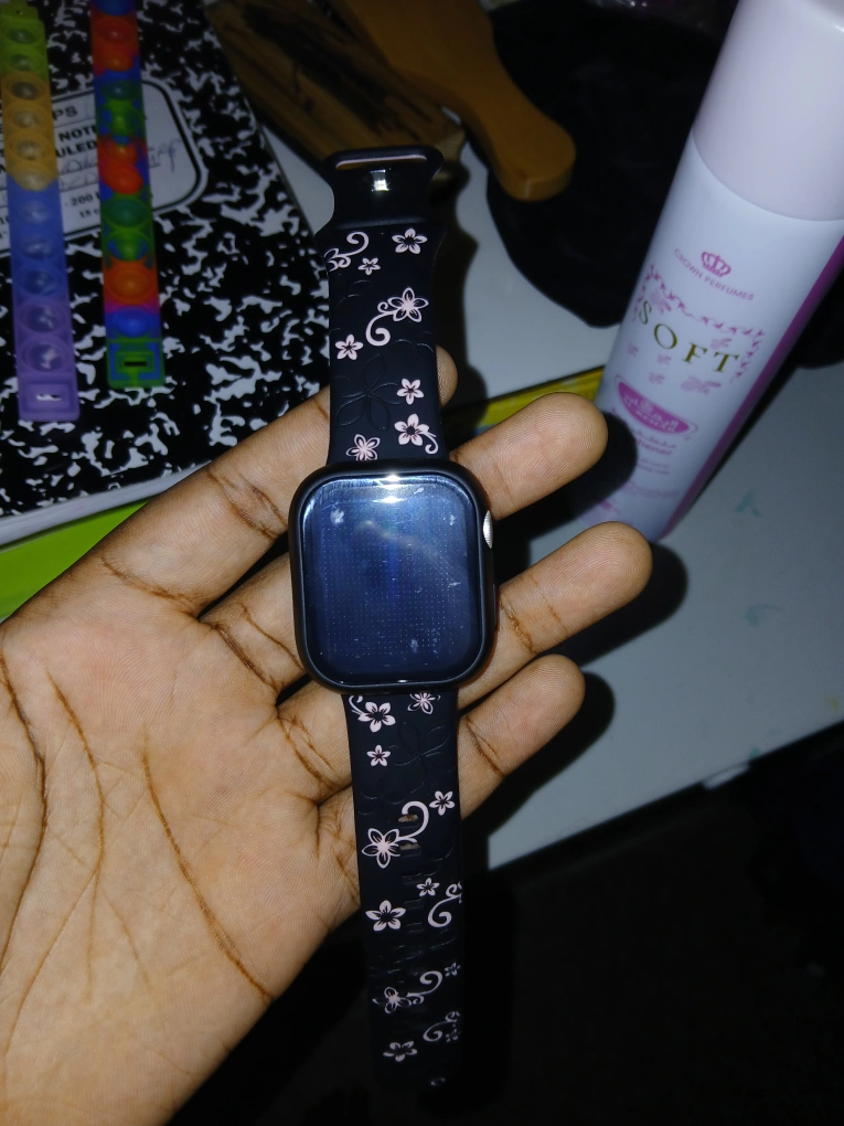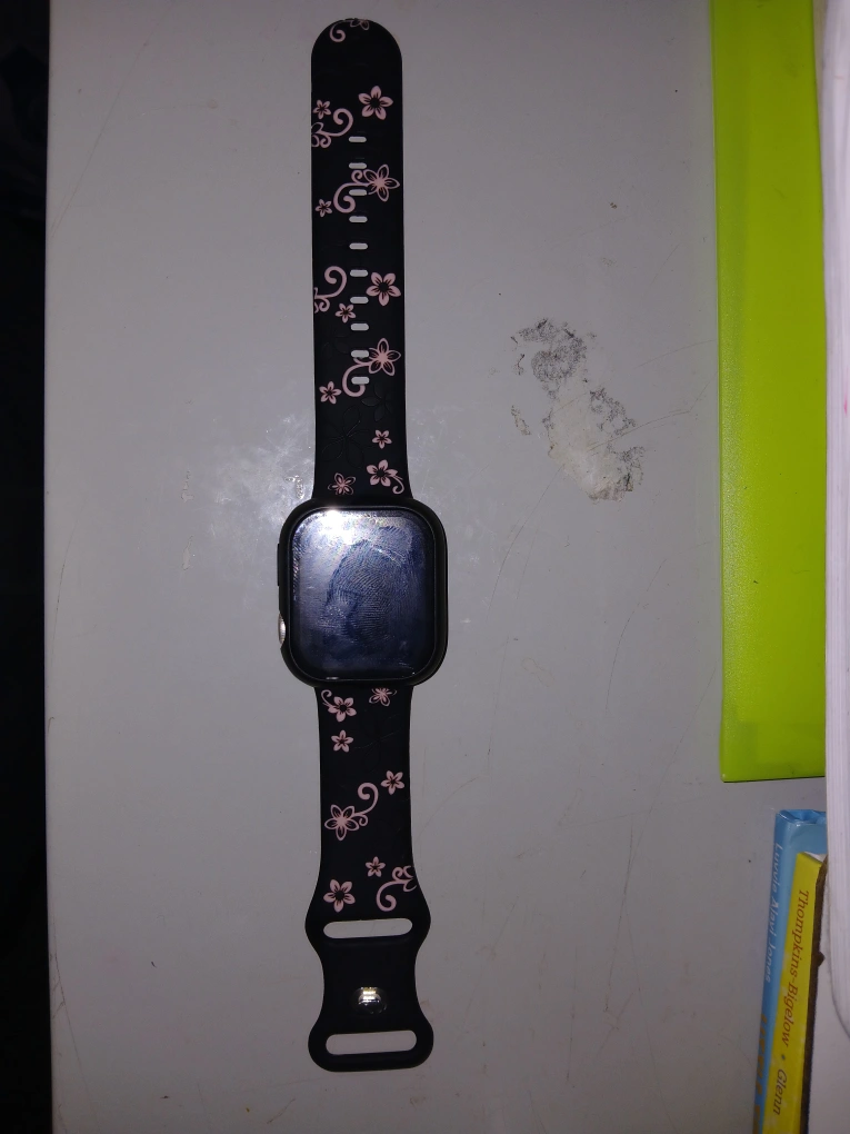 25Selling a smart watch with a cute flower design band! The watch is in good condition and ready for a new owner. It has a black case and comes with a pink band as well!