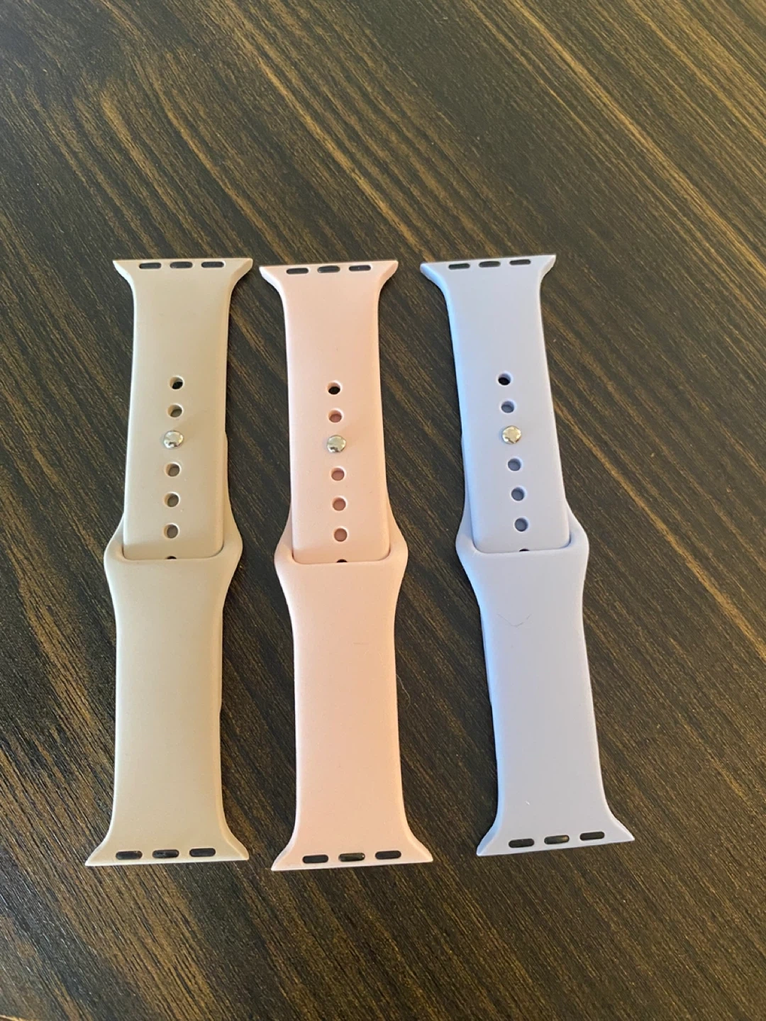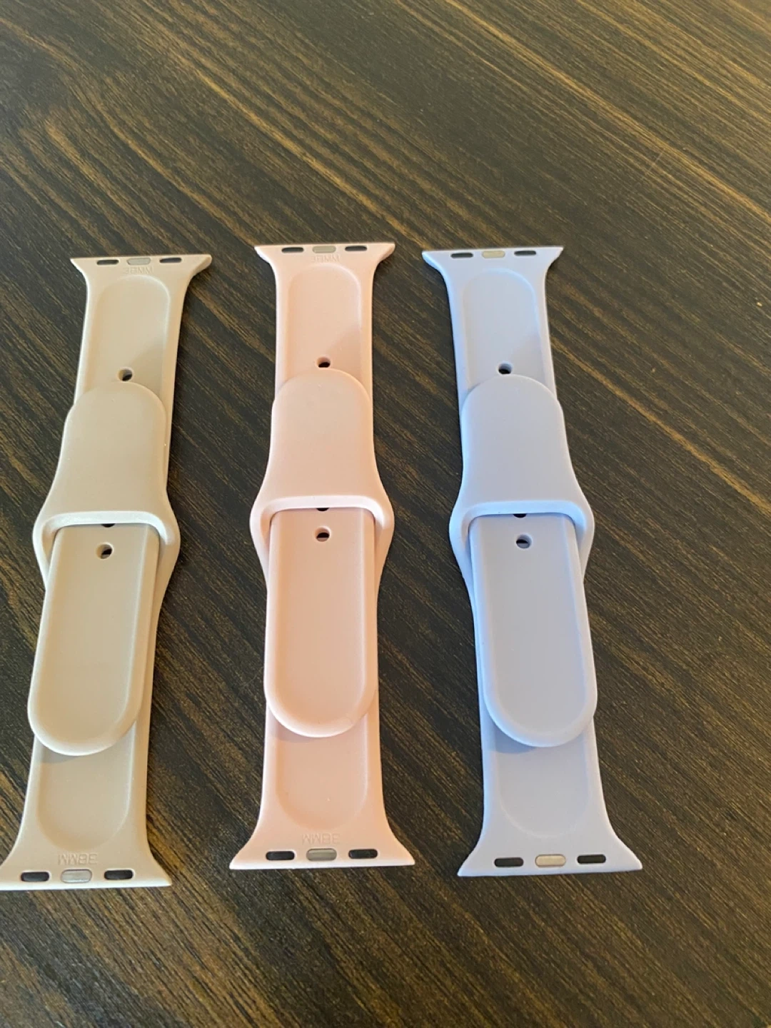 Selling a set of three Apple Watch bands in great condition! The colors are beige, pink, and lilac. They're perfect for adding a pop of color to your Apple Watch and are super easy to swap out