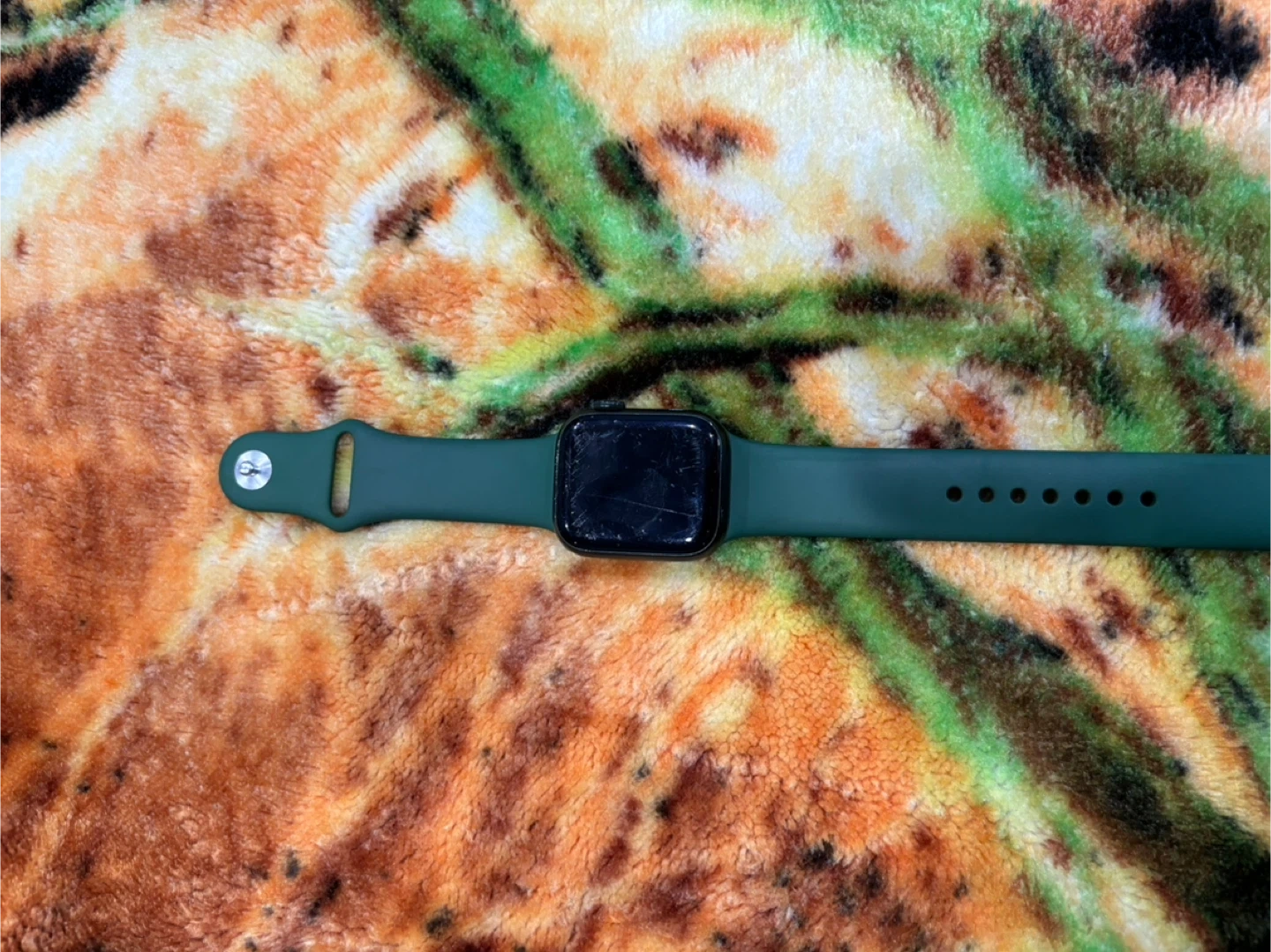 10Selling an Apple Watch with a green band. It comes with its charger. The watch is in used condition and has some scratches on the screen.
