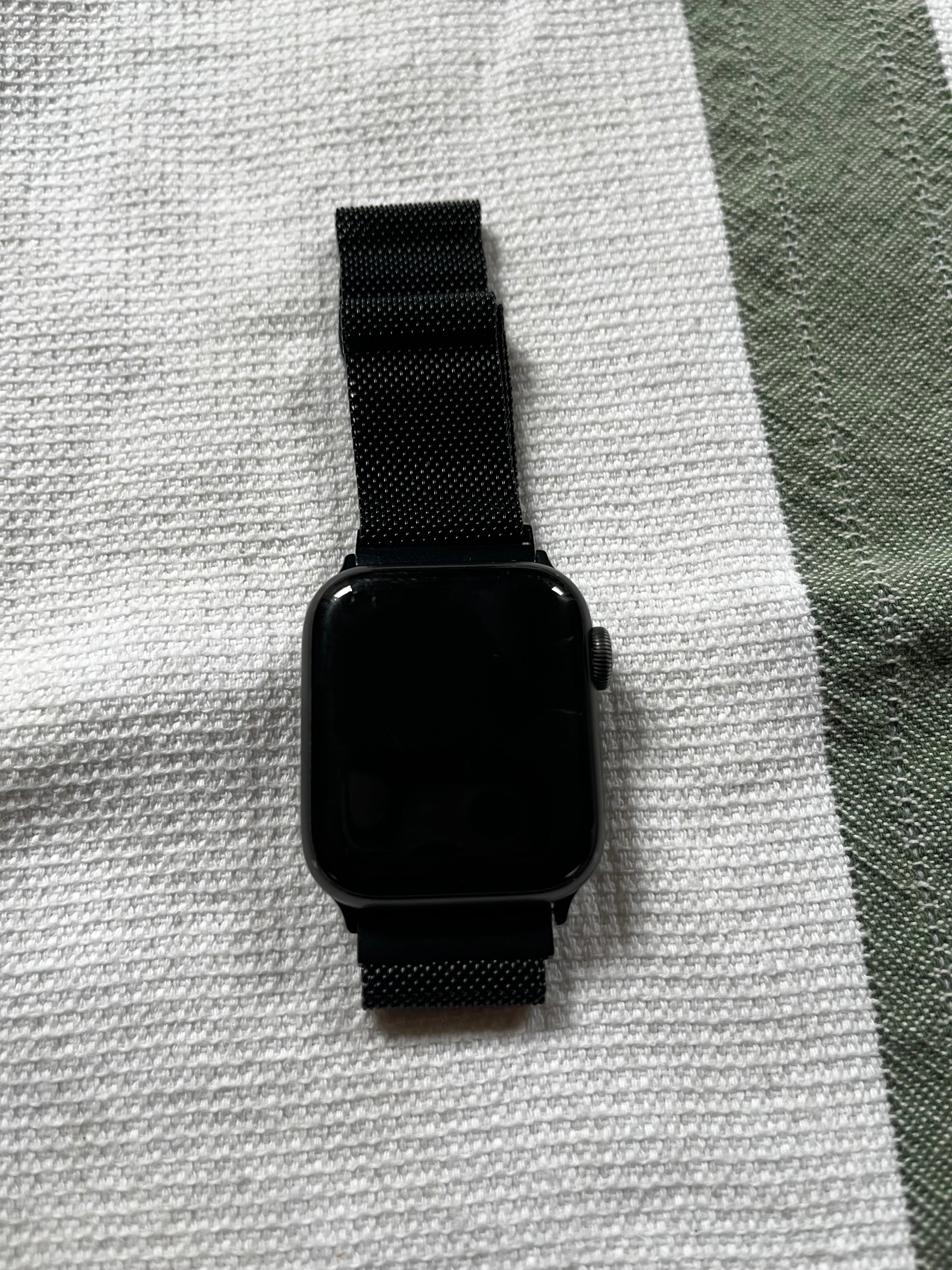 Used Apple watch in decent condition. The screen has some scratches from normal wear and tear. Comes with a black stainless steel mesh strap.