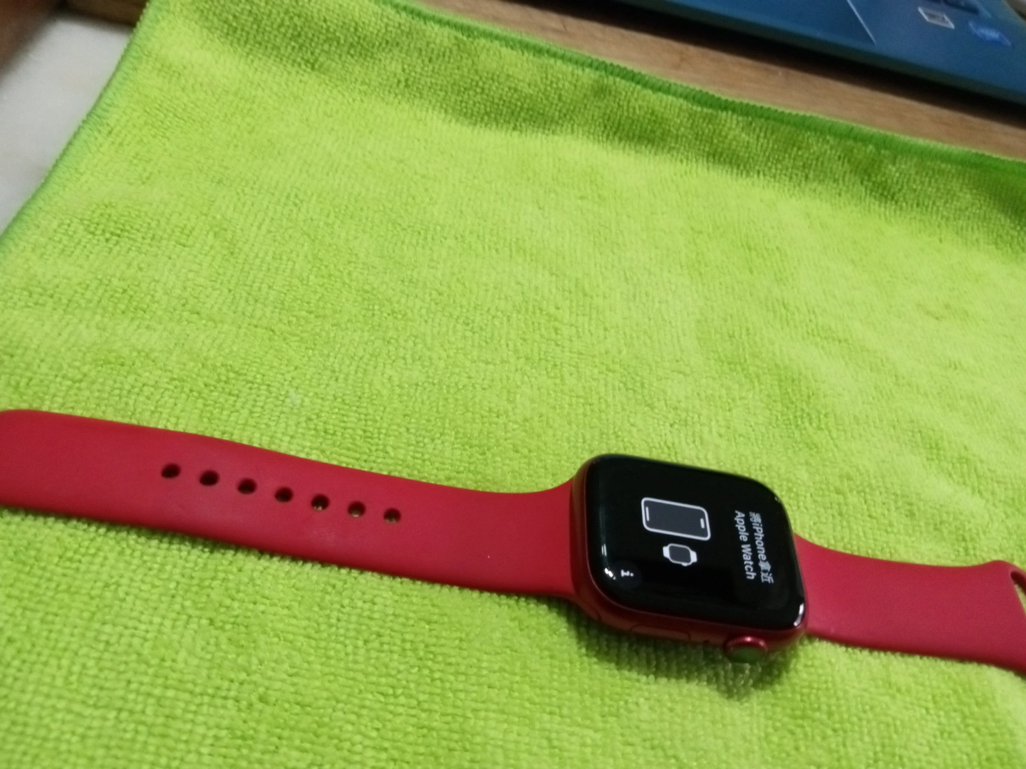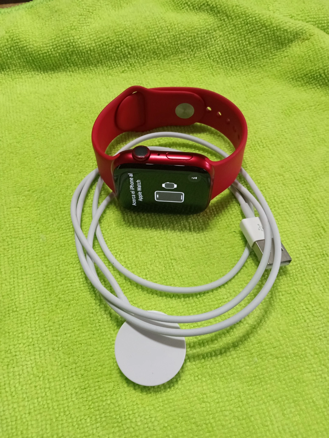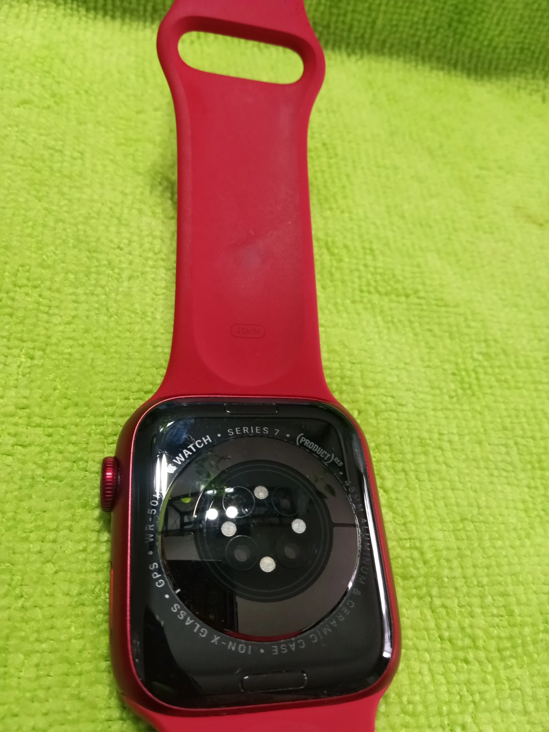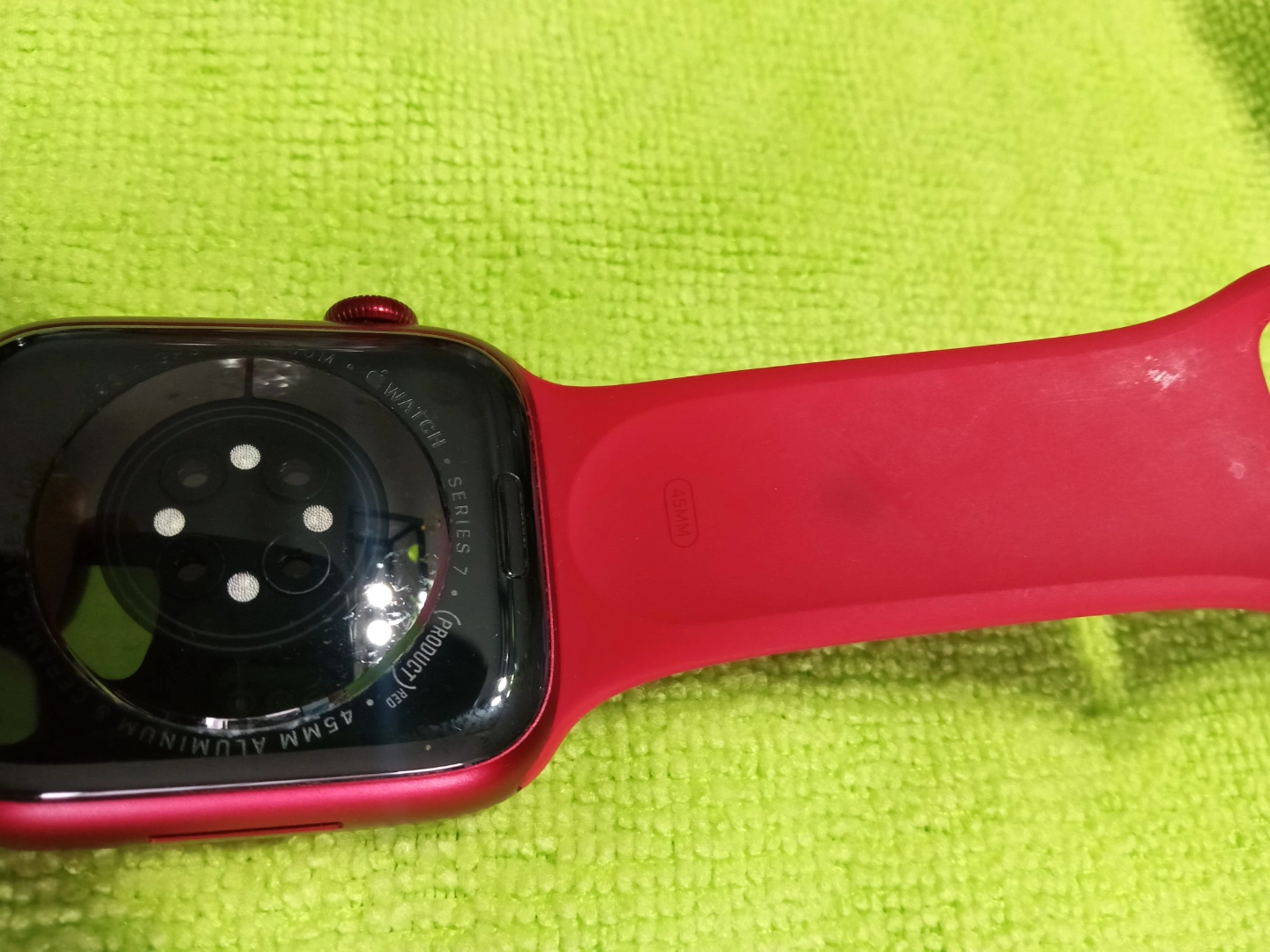 Apple Watch Series 7, 45mm red aluminum case with red sport band. GPS model. Setup screen shown. Pre-owned.