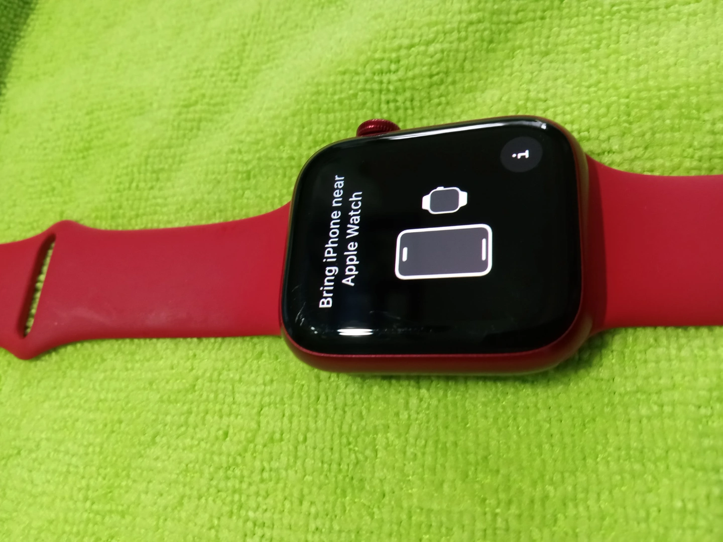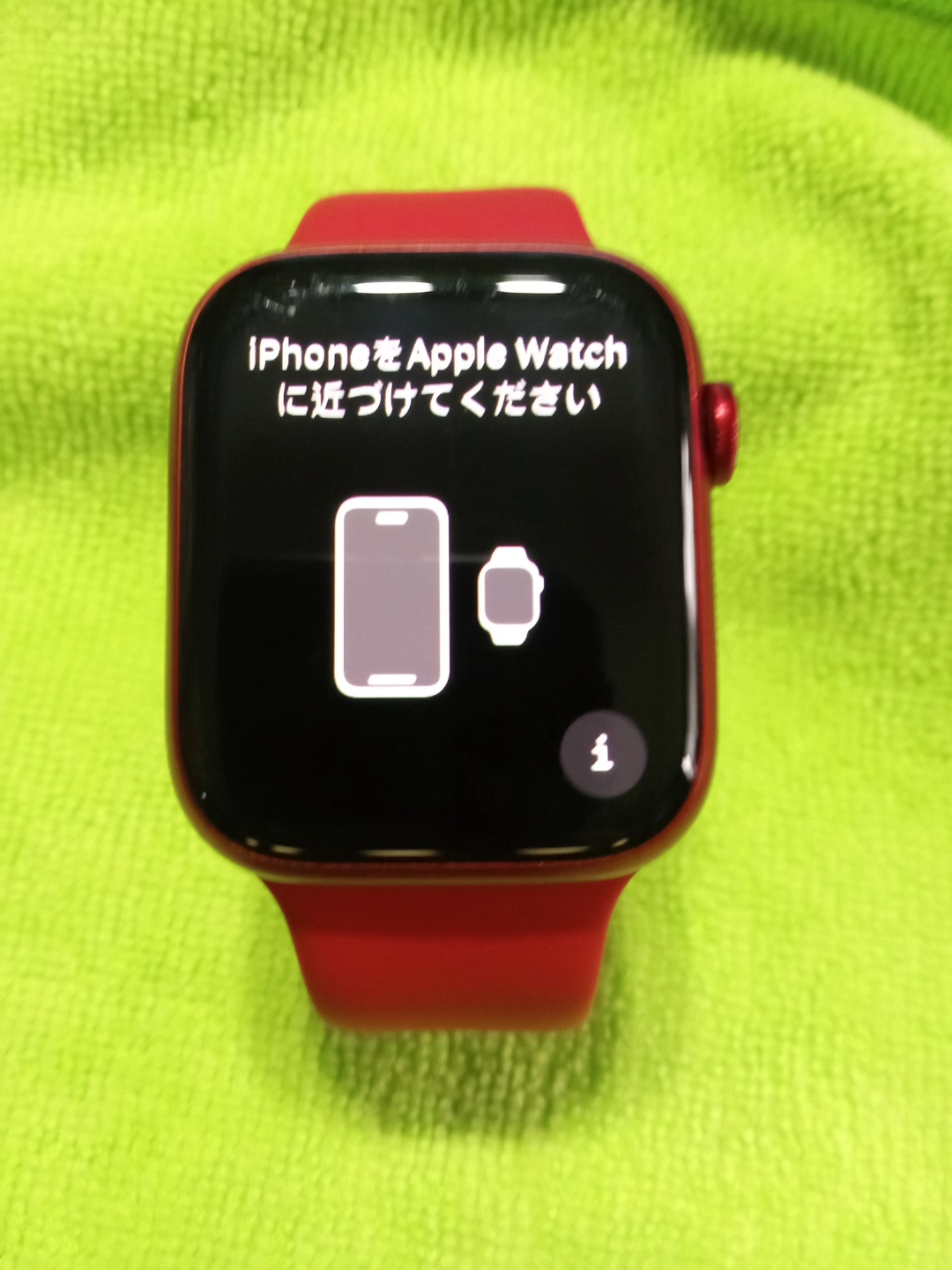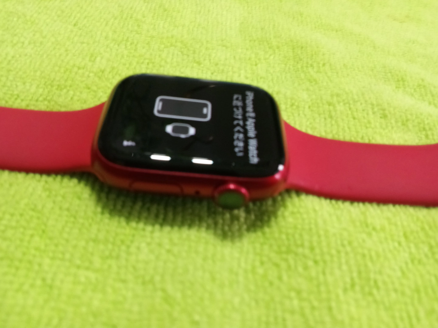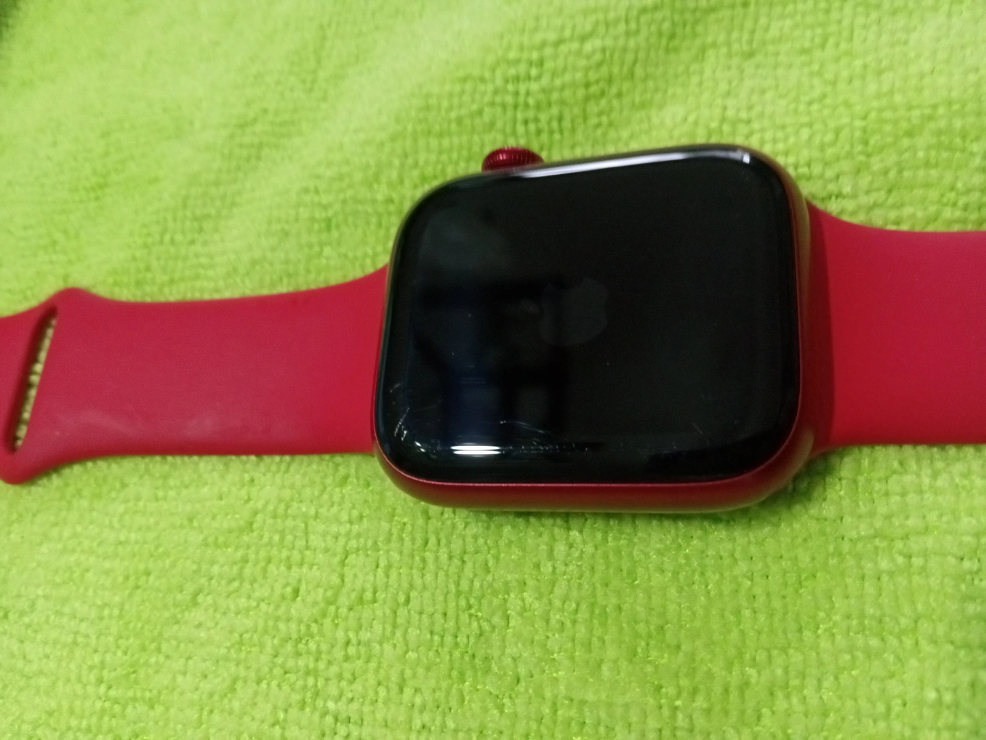 Apple Watch Series 7, 45mm red aluminum case with red sport band. GPS model. Setup screen shown. Pre-owned.
