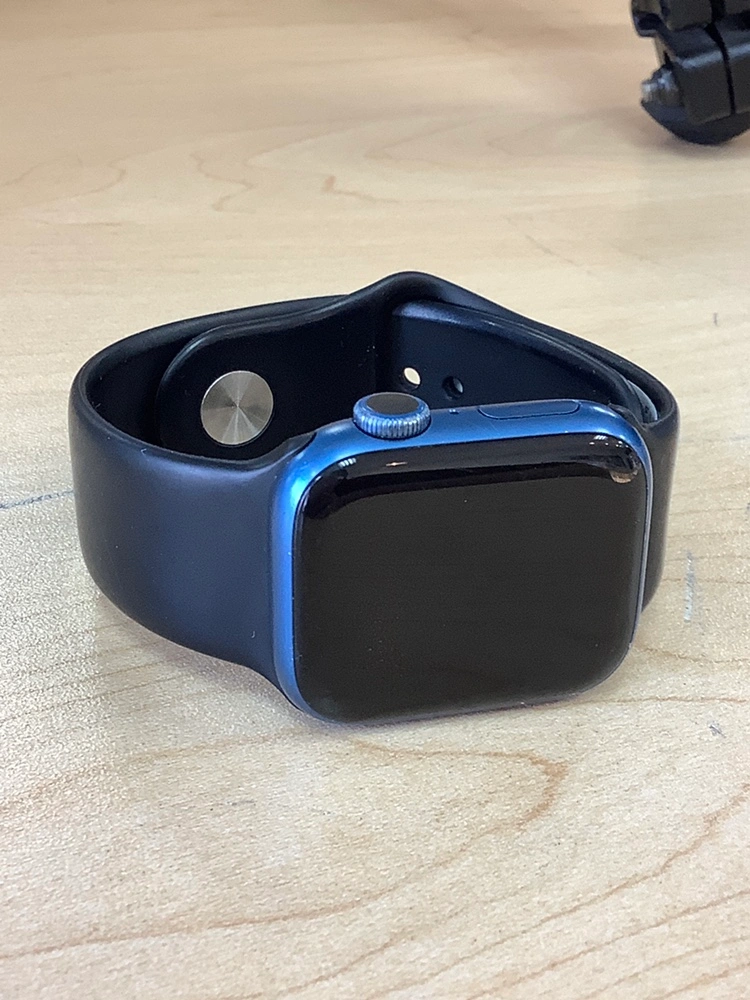 This is an Apple Watch Series 7. It is a blue aluminum case with a black sport band. The watch is in great condition.