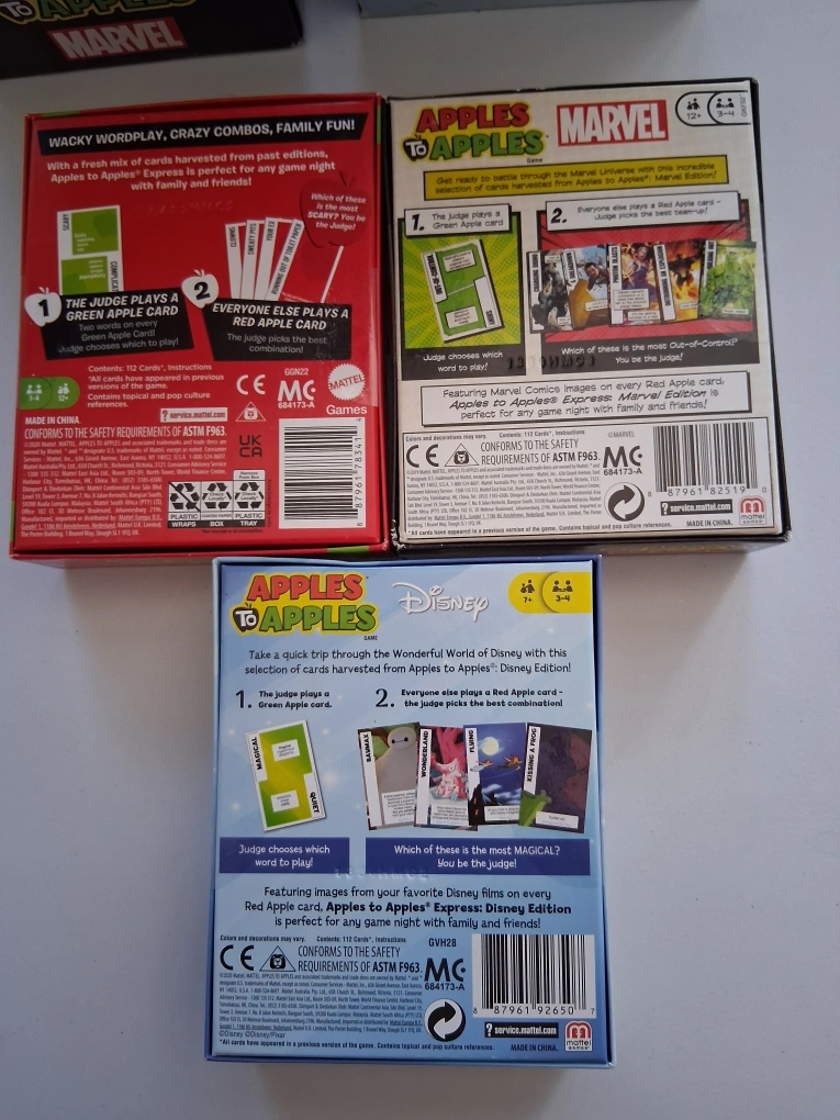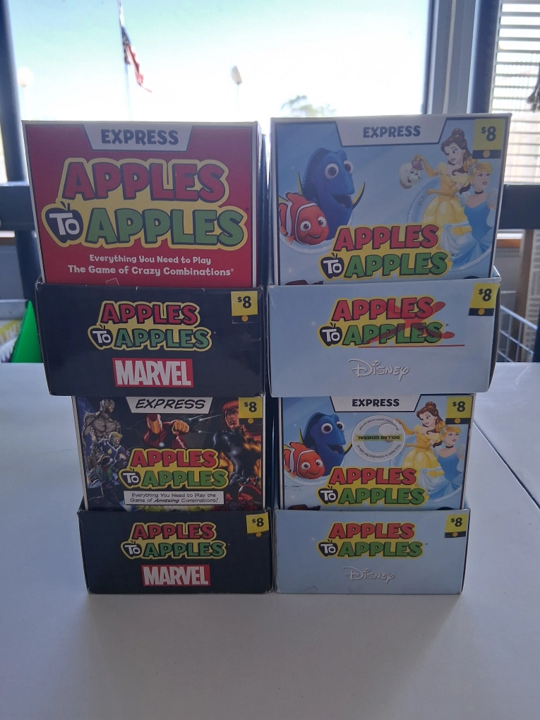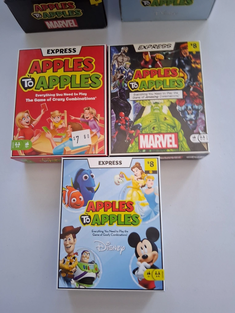 147I have a few Apples to Apples Express card games for sale! They're all brand new and ready for some family fun. - Marvel version: Get ready to battle through the Marvel Universe with this incredible selection of Apples to Apples cards featuring Marvel Comics images. $5.00 each. - Disney version: Take a quick trip through the Wonderful World of Disney with this selection of cards harvested from Apples to Apples: Disney Edition