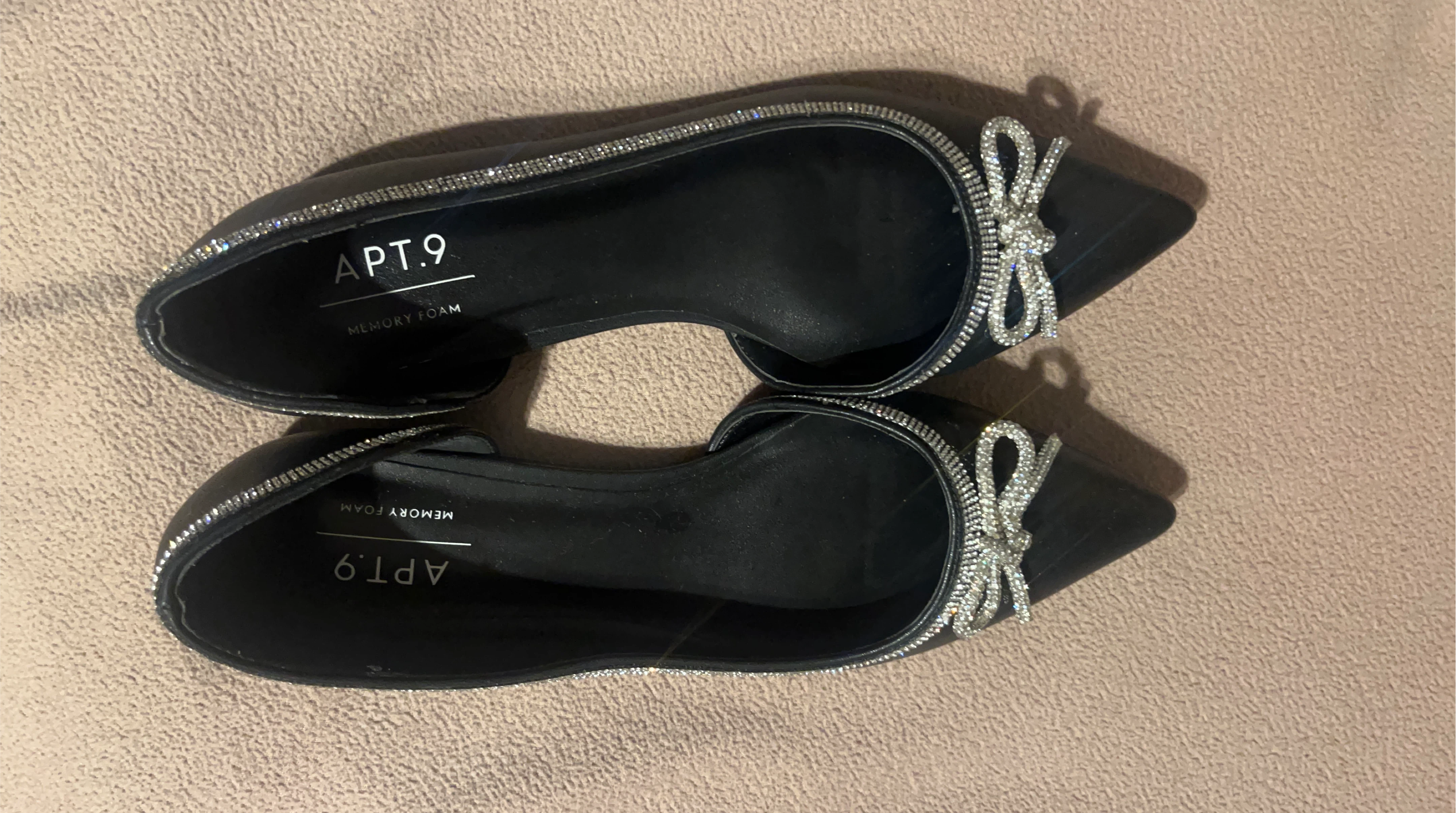 Cute Apt. 9 black flats with memory foam insoles. They feature a pointed toe and a decorative bow. Perfect for adding a touch of sparkle to your outfit!