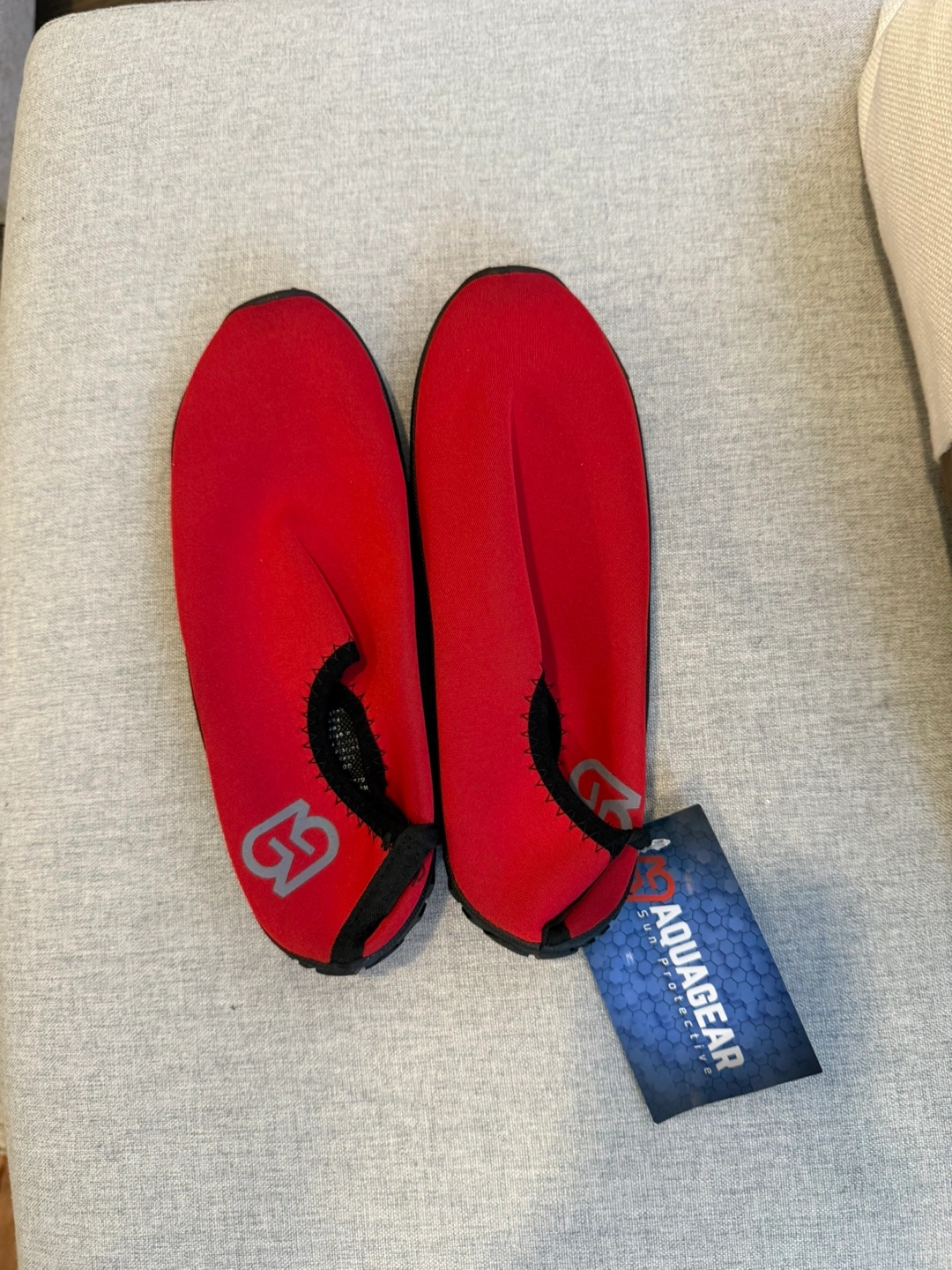 5Keep your feet protected with these Aqua Gear water shoes ! They are sun protective and perfect for any water activity. Shoes are red and feature a black trim.