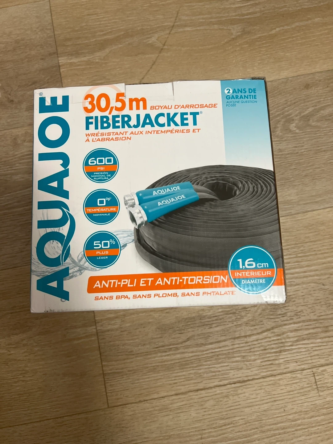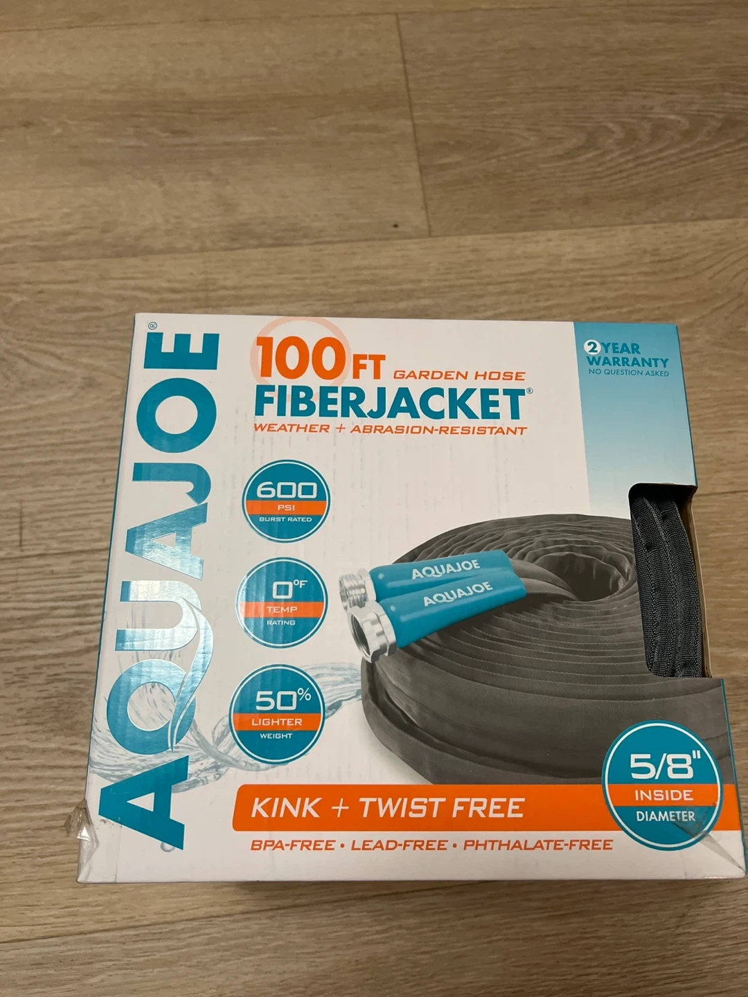 I'm selling a brand new Aqua Joe FiberJacket garden hose! It's 100 feet long and features a weather and abrasion-resistant design. It's also kink and twist-free, making it easy to use. The hose is 50% lighter in weight and has a 5/8" inside diameter. It can handle up to 600 PSI burst rating.