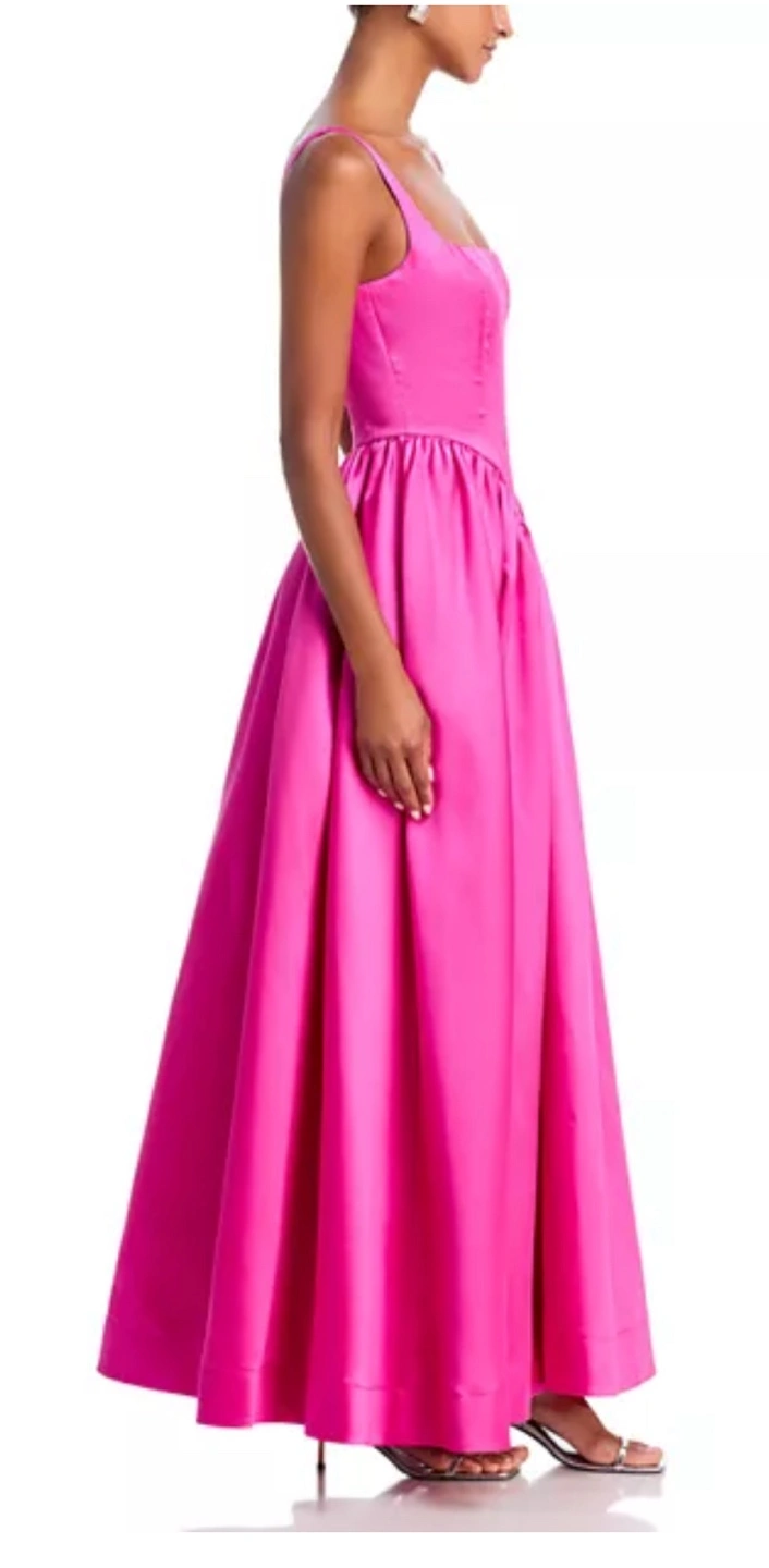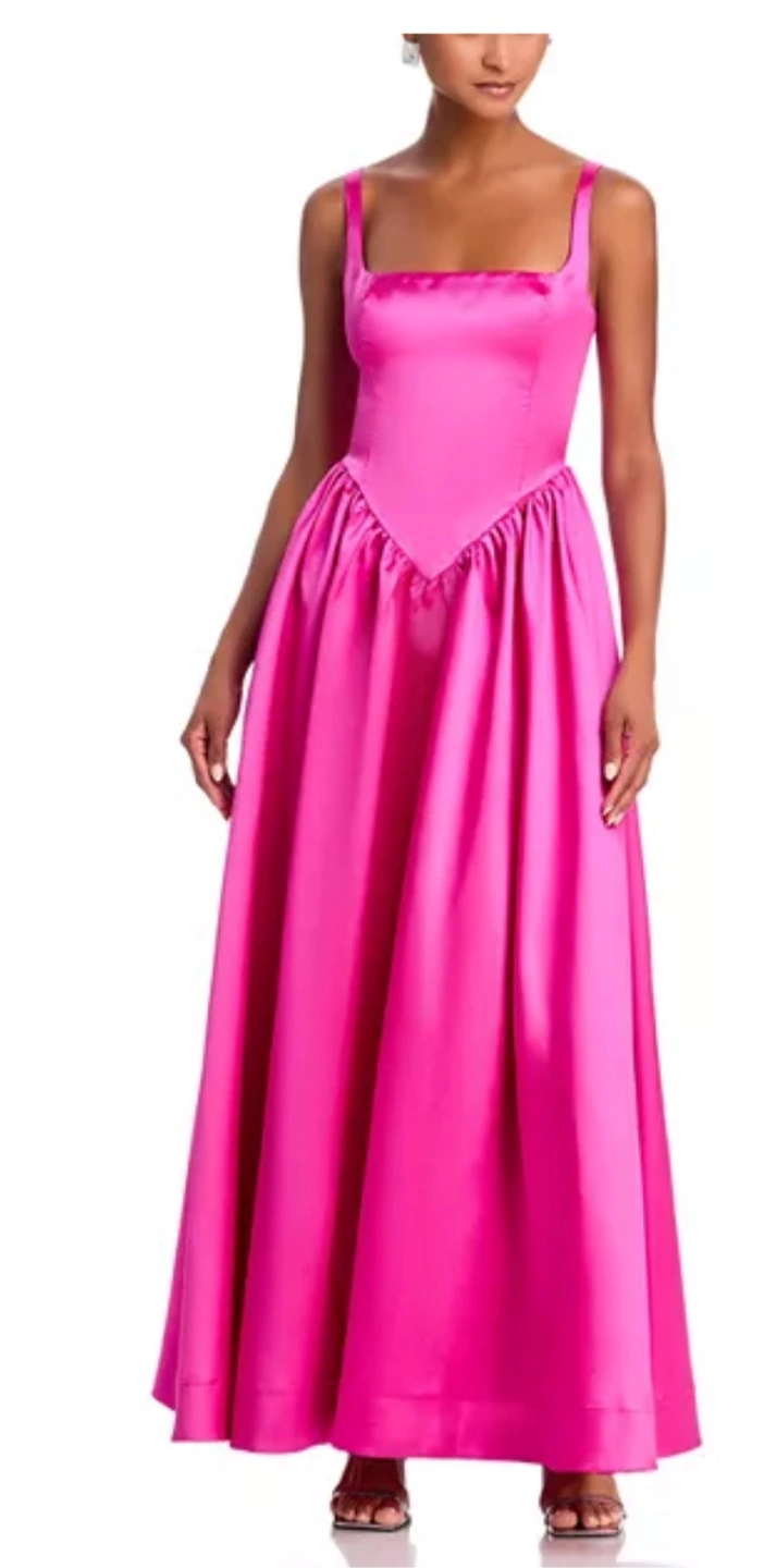 A beautiful satin ball gown. Features a square neckline and wide straps. The bodice has a fitted design, while the skirt flows out beautifully. A stunning gown that would be perfect to make someone feel amazing. Brand new with ticket from Bloomingdale’s size large