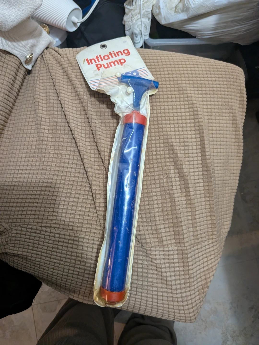 This is an inflating pump. It's blue and red with a white handle. It comes in original packaging.