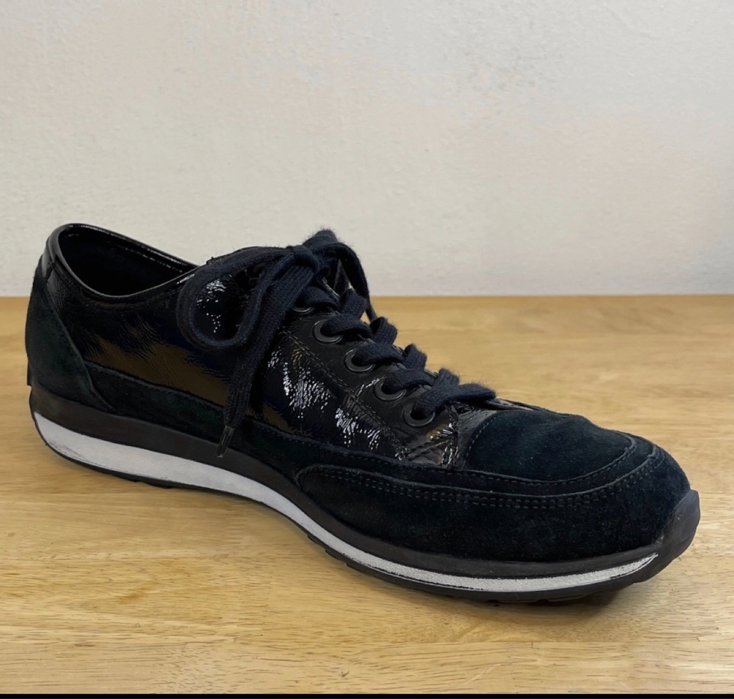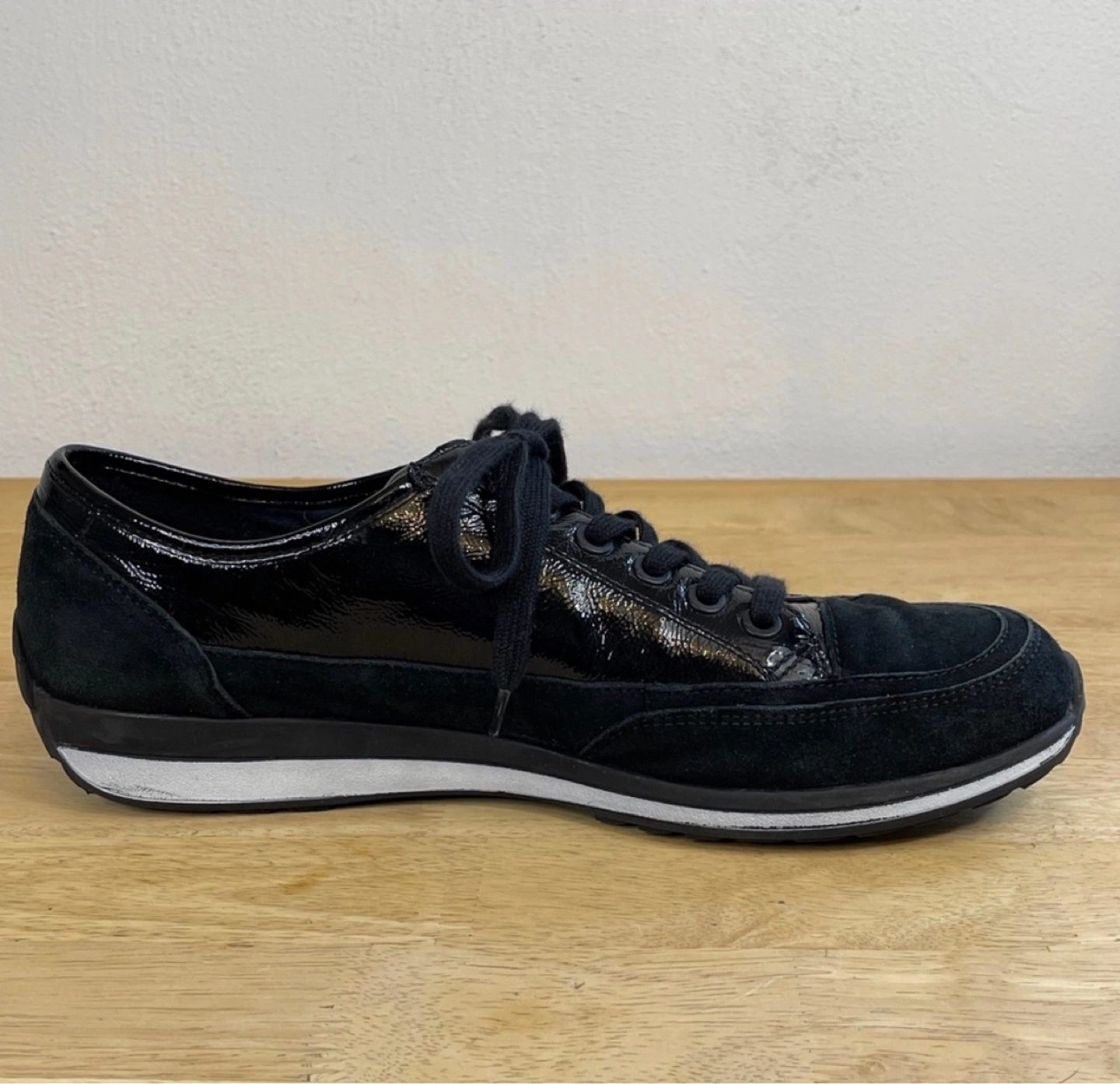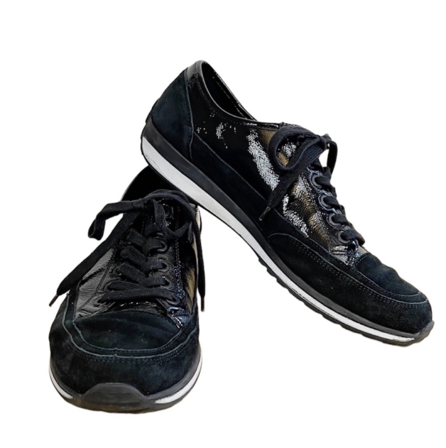 Black sneakers. Patent leather and suede upper. Lace-up closure. White rubber sole. Comfortable shoes.