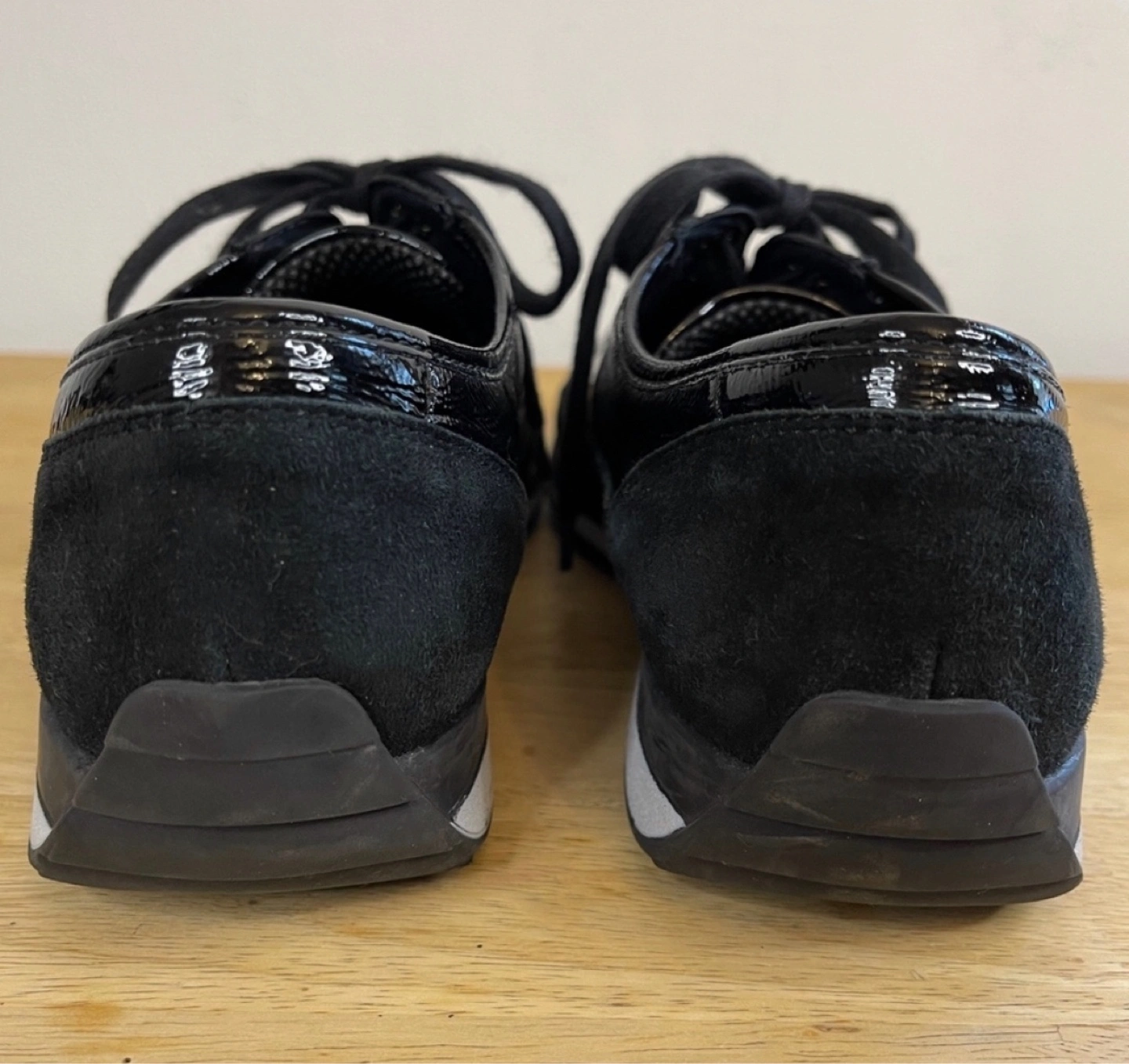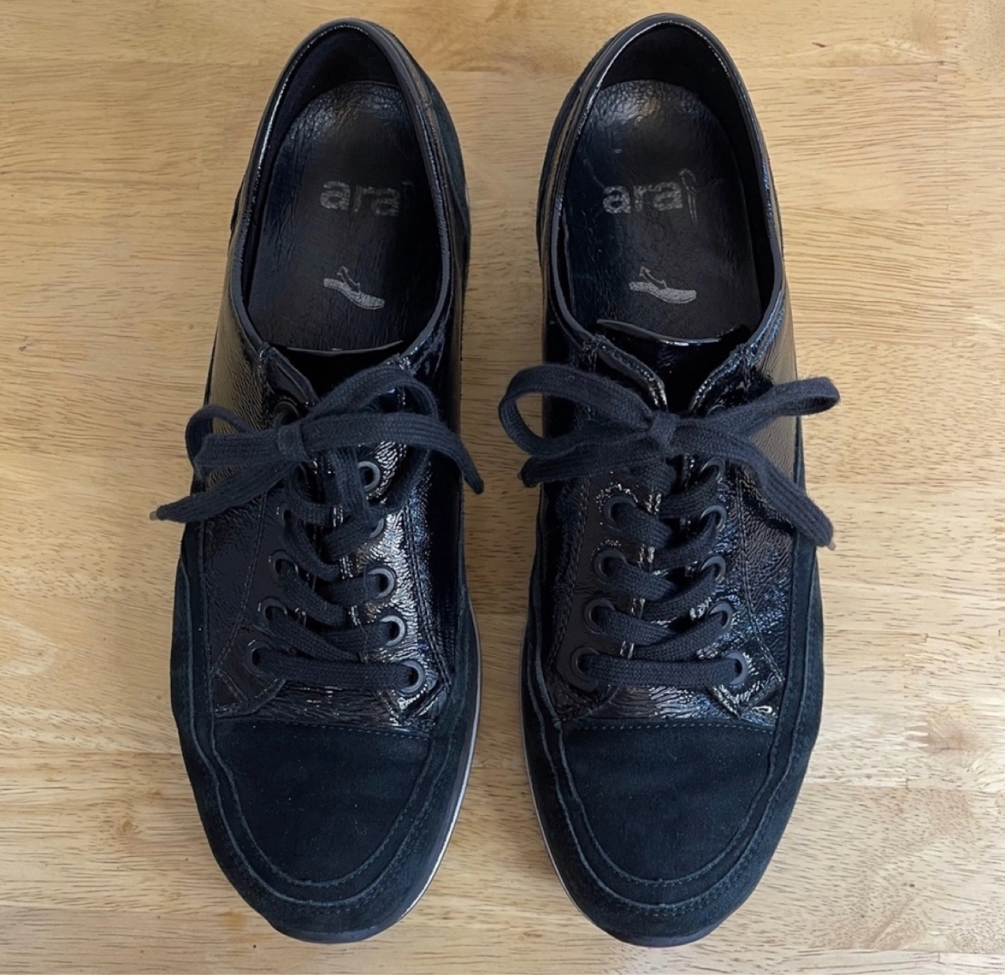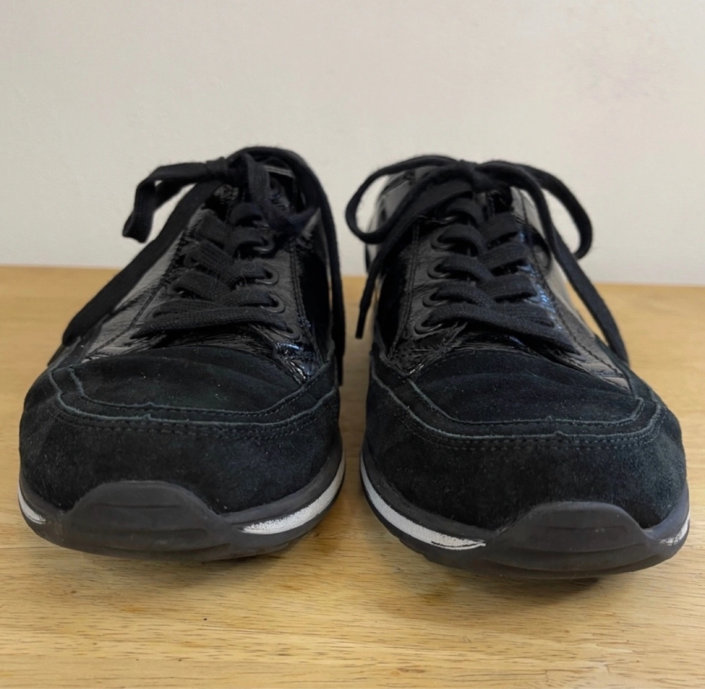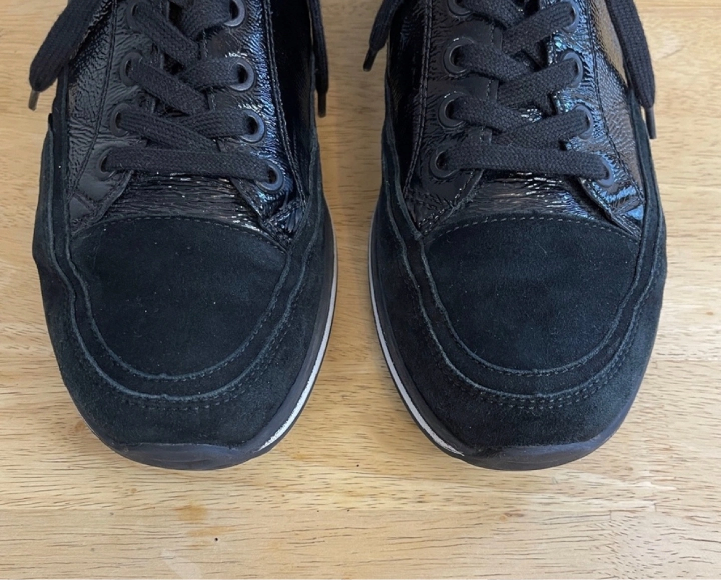 Black sneakers. Patent leather and suede upper. Lace-up closure. White rubber sole. Comfortable shoes.