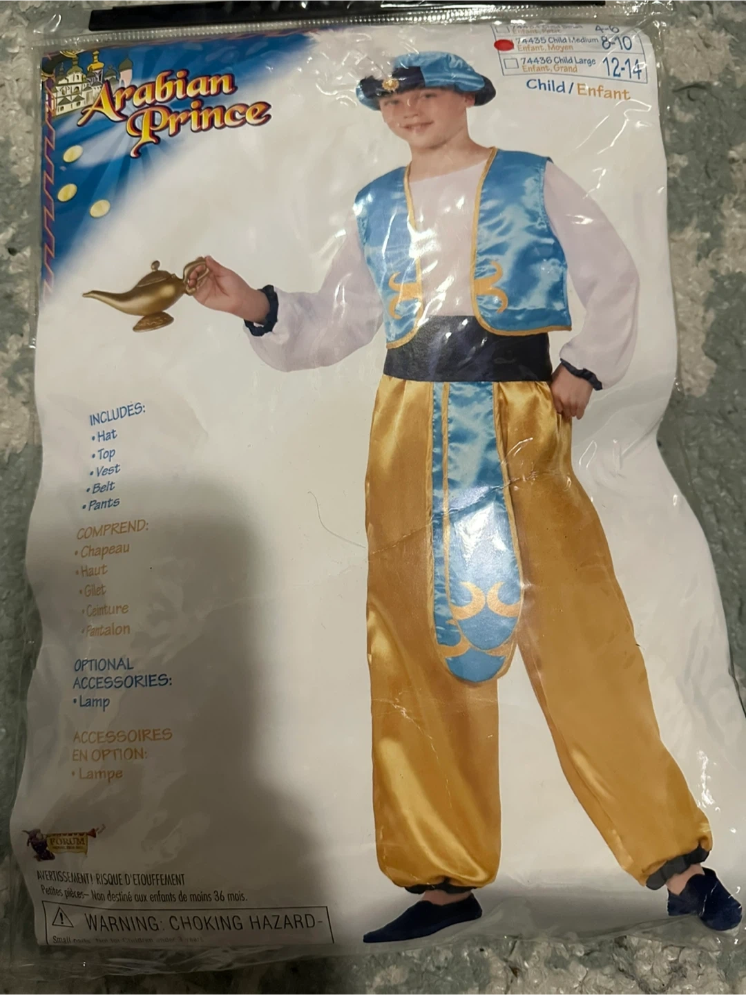 Selling an Arabian Prince costume for a child, size 12-14! Includes a hat, top, vest, belt, and pants. There is also an optional lamp accessory. Perfect for Halloween or dress-up!