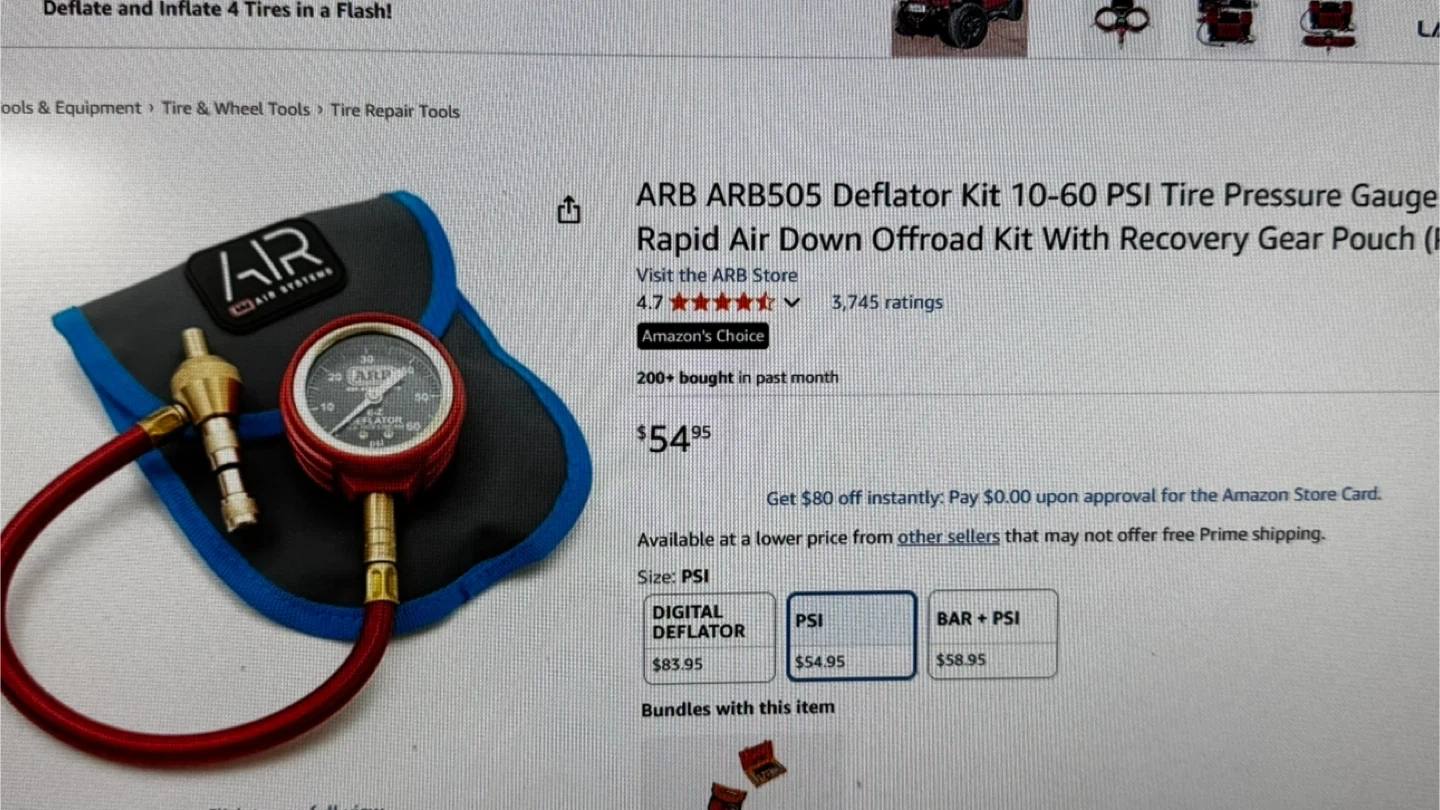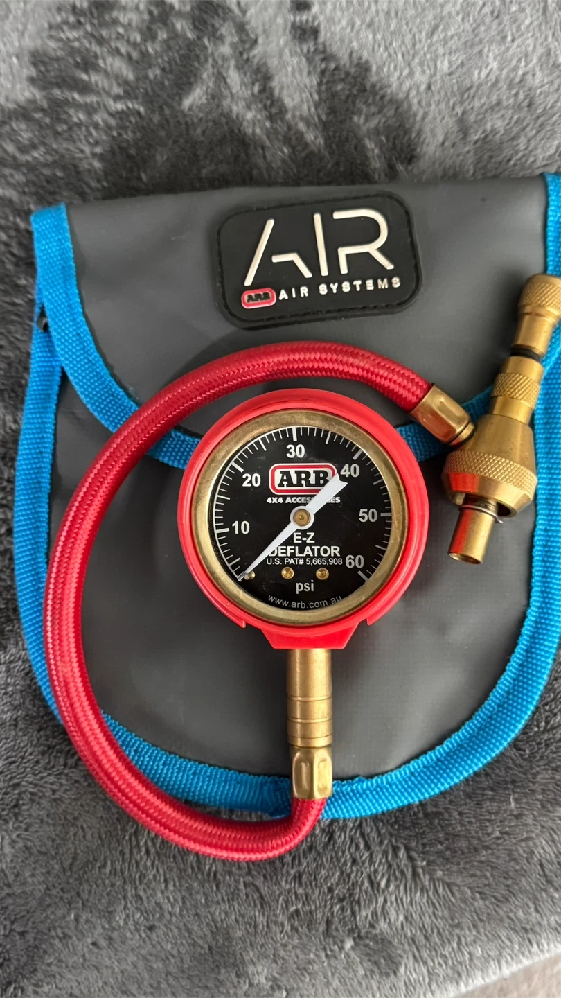 Selling an ARB ARB505 Deflator Kit, perfect for quickly deflating tires. It measures pressure from 10 to 60 PSI. Originally bought for $54.95. Comes with a handy recovery gear pouch