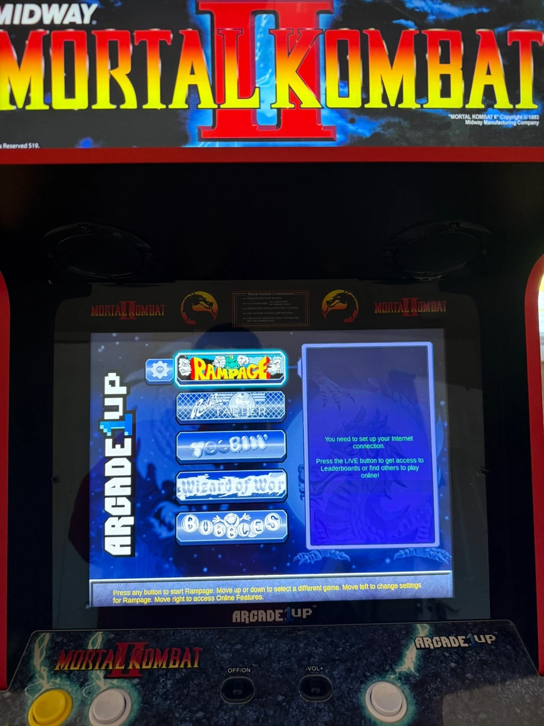 60Selling an Arcade1Up Mortal Kombat II home arcade machine. It's in great shape and ready for some button-mashing action! Enjoy classic games like Rampage, Joust, Wizard of Wor, and Bubbles, all in one machine