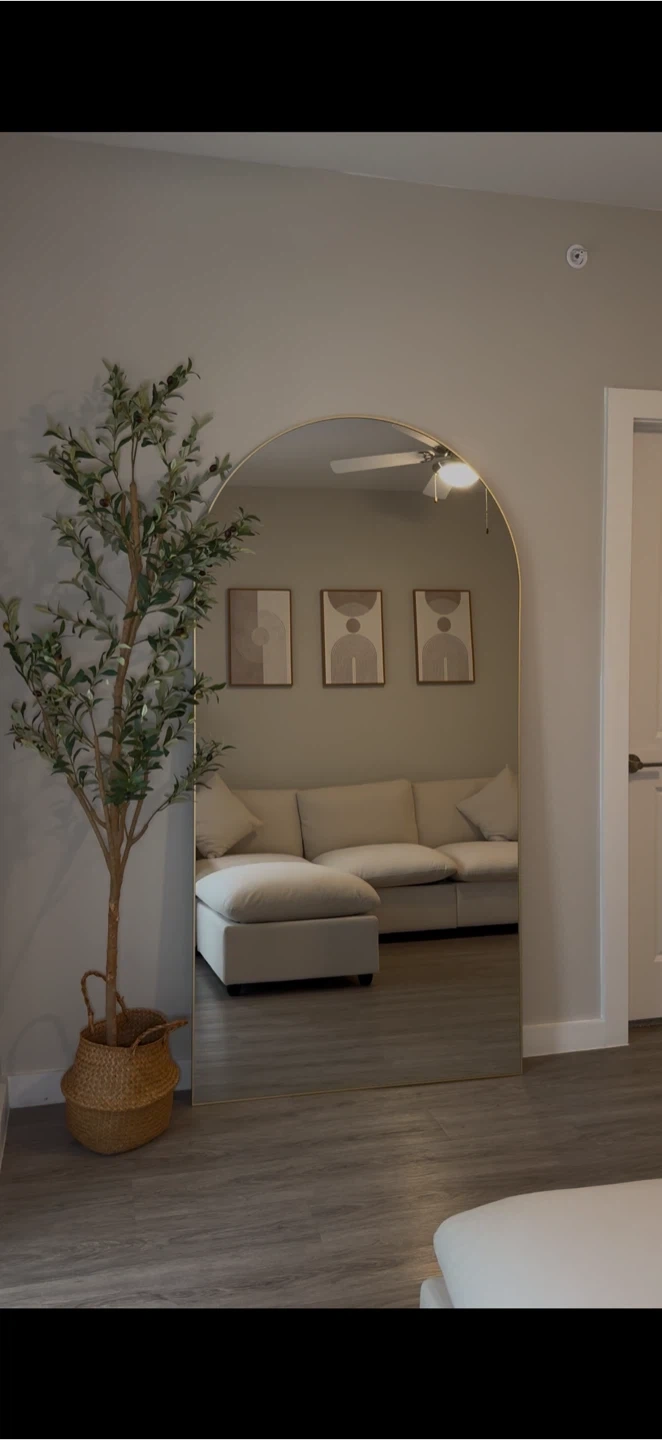 65Selling a beautiful arch mirror with a gold frame. It's in great condition and would look lovely in any room! The mirror reflects a spacious living area with a comfortable-looking sectional sofa and stylish wall art