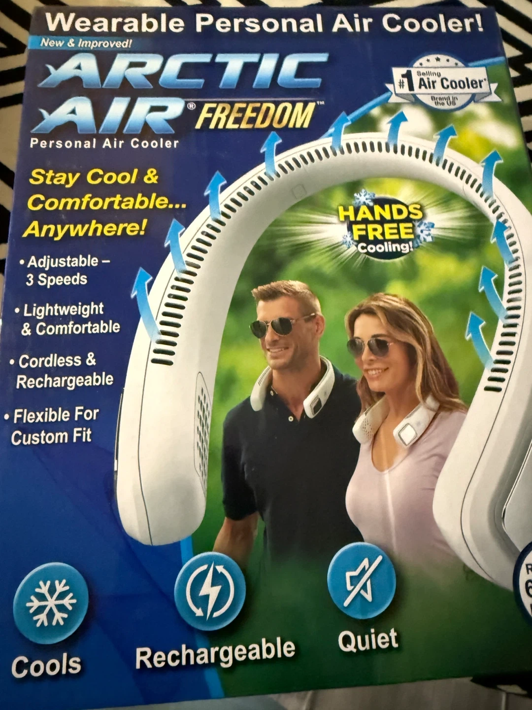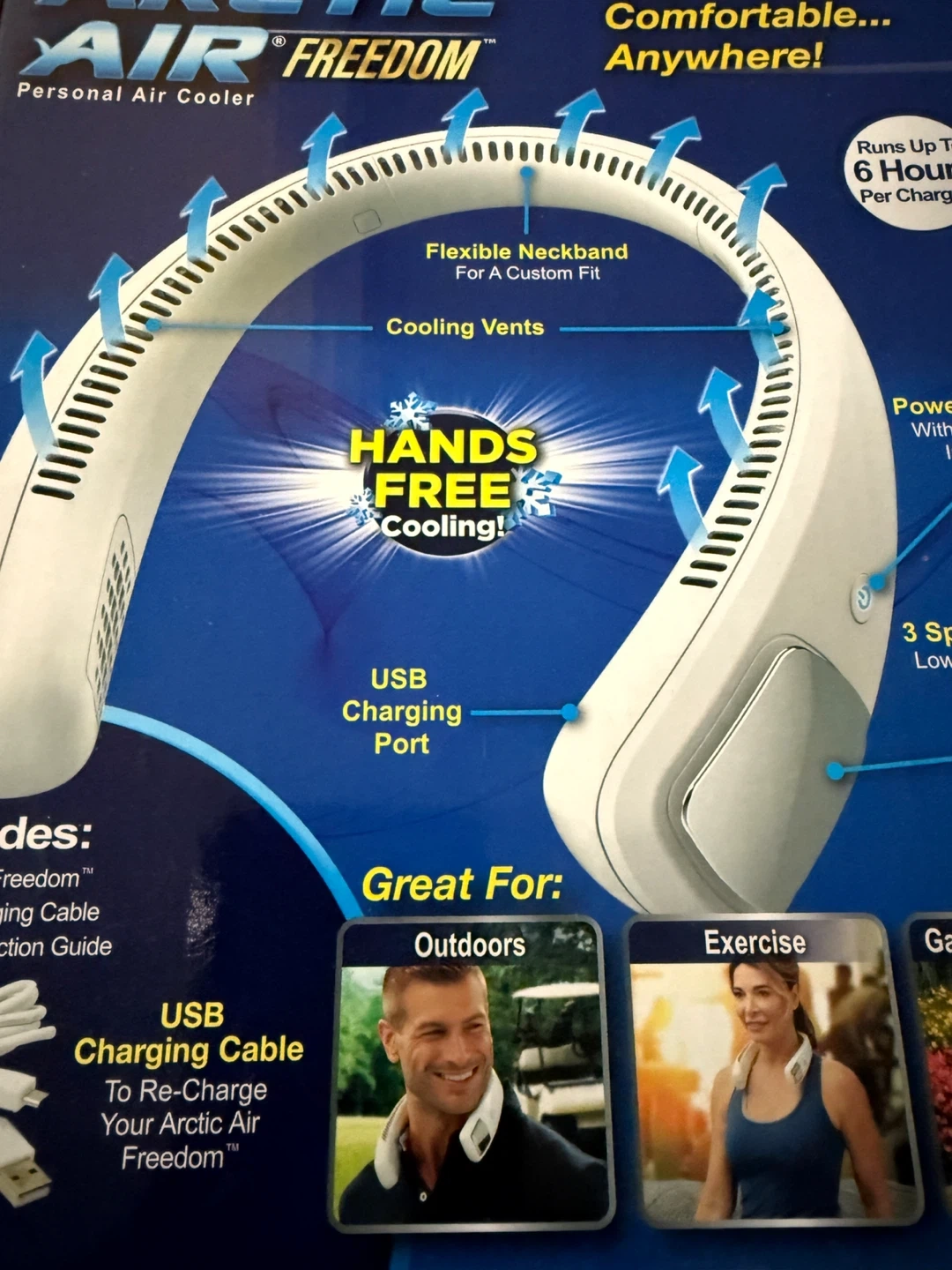 353Stay cool and comfortable anywhere with this wearable personal air cooler! It features adjustable 3 speeds, is lightweight and comfortable, cordless and rechargeable, and has a flexible neckband for a custom fit. It runs up to 6 hours per charge and includes a USB charging cable