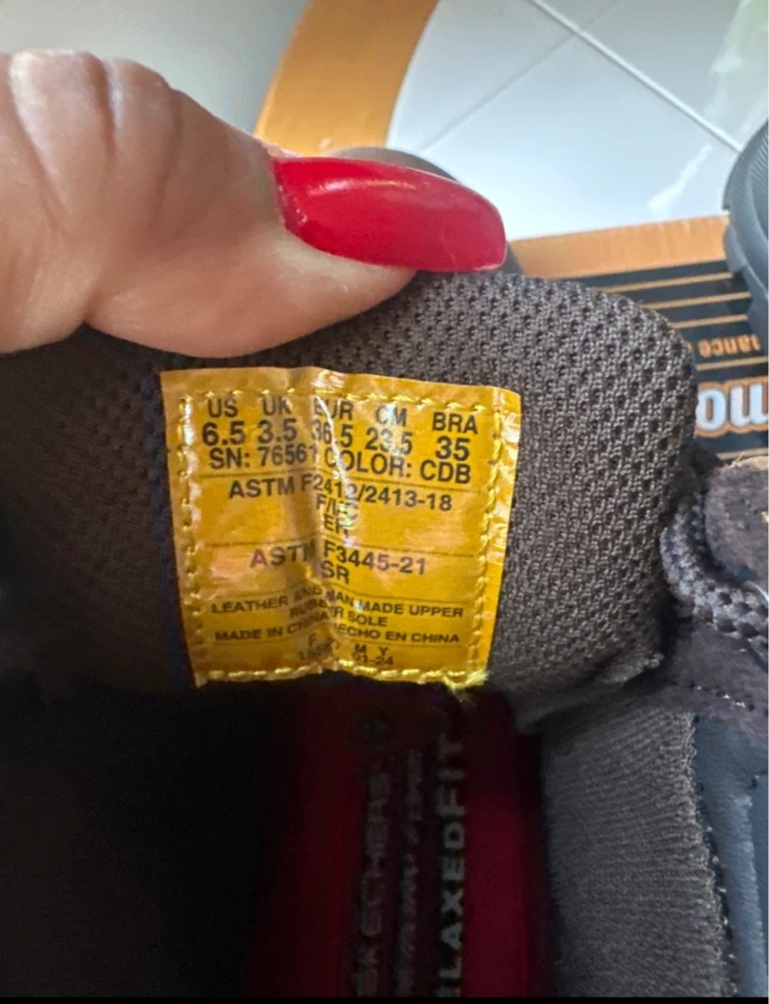 Women's Skechers steel toe work boots in dark brown. Features memory foam insoles and slip-resistant outsoles. Electrical hazard protection. Leather and man-made upper.