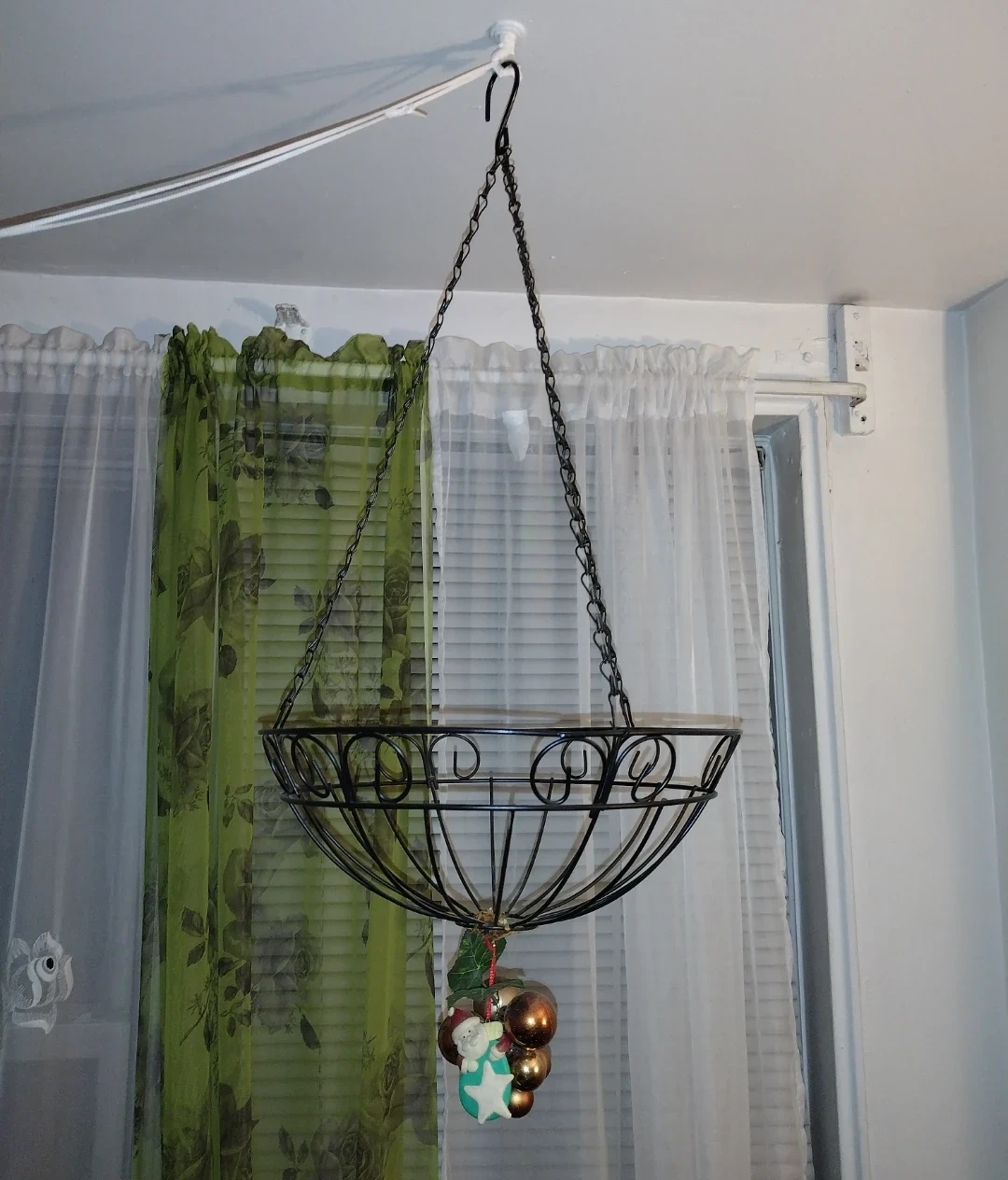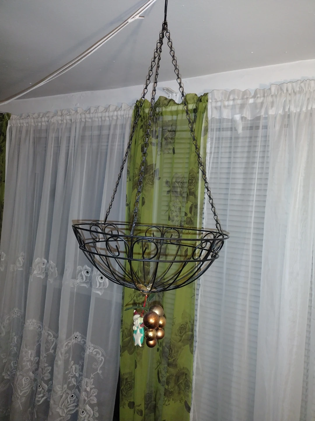 Metal hanging basket with decorative chains. Includes a small cluster of decorative ornaments. Perfect for adding greenery indoors or outdoors!